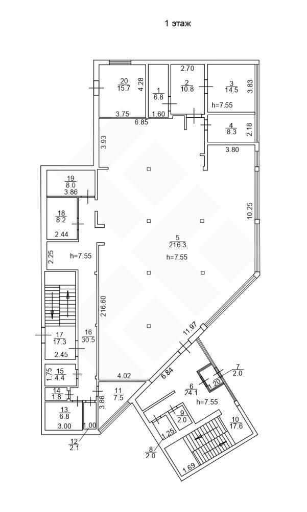 Высота потолков: 1 этаж - 7,55 метра, 2 этаж - 3,9 метра