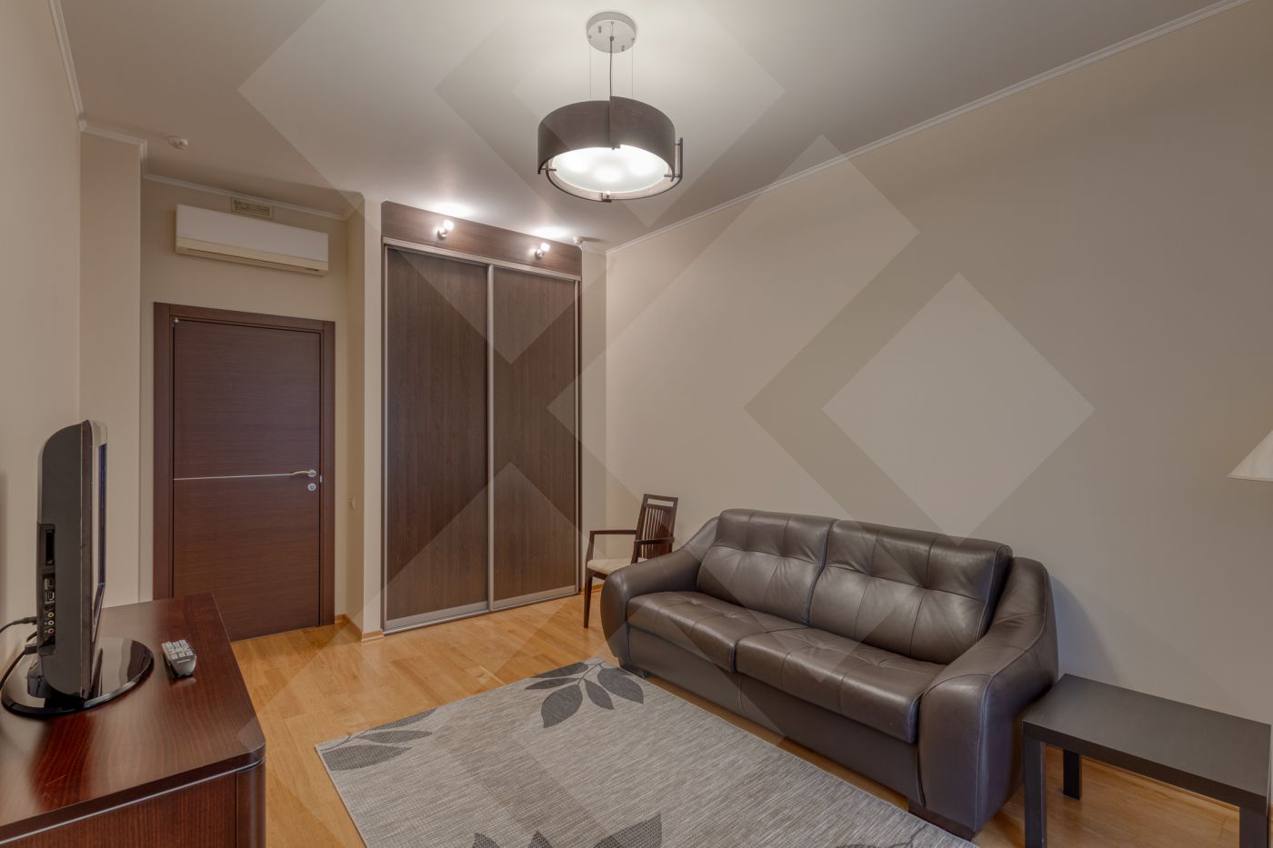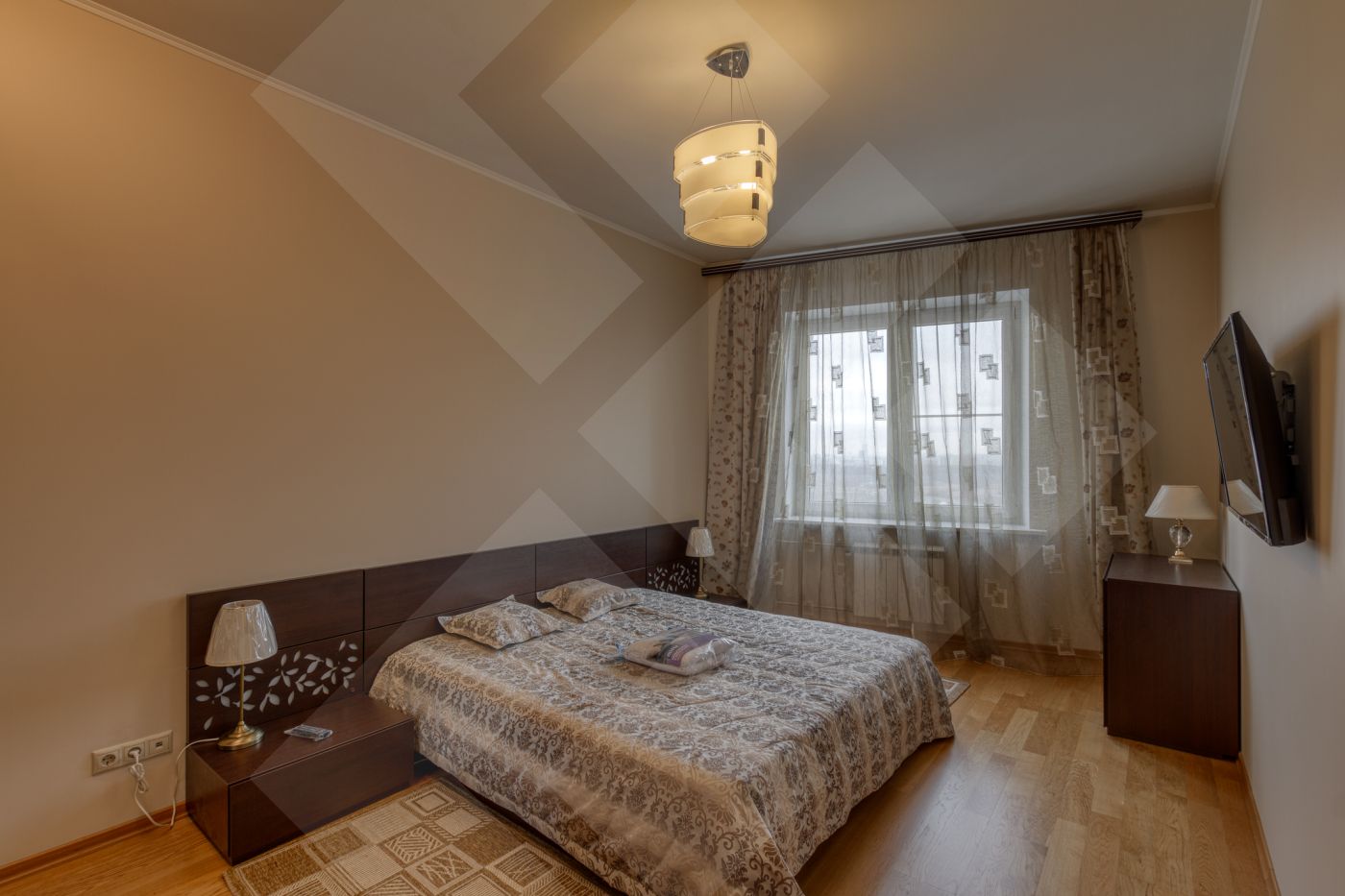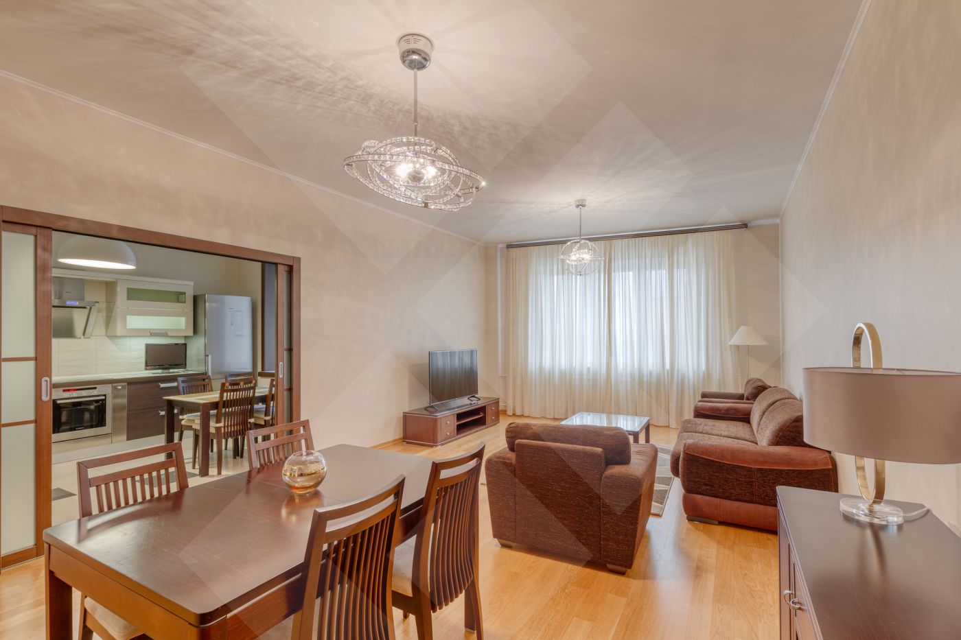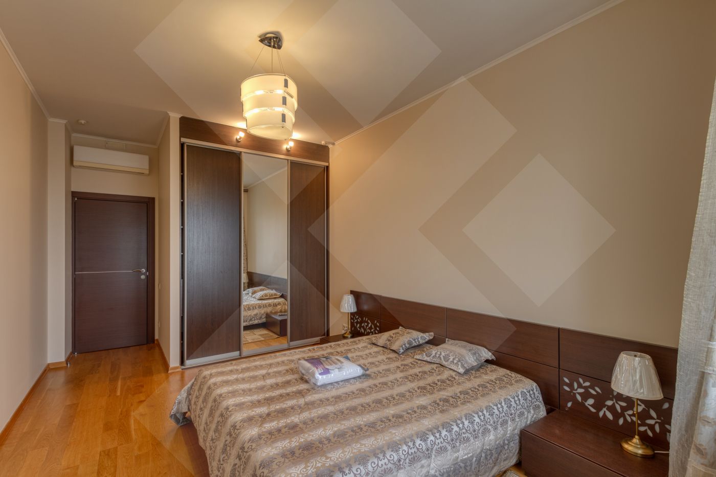 Планировка: две спальни с гардеробными, кухня, гостиная. Два санузла оборудованы качественной европейской сантехникой.