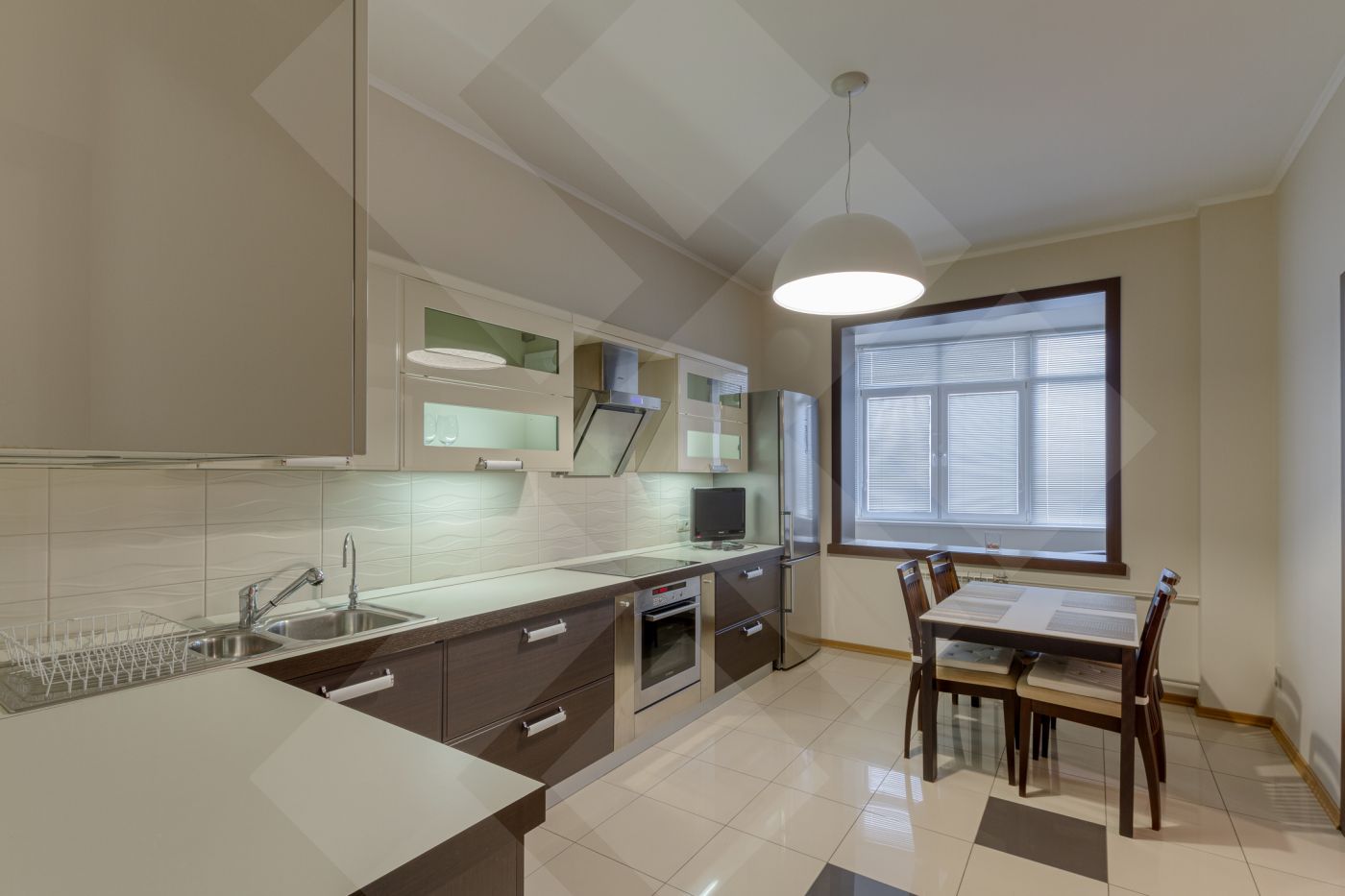 Встроенная кухня со всей необходимой бытовой техникой для комфортной жизни.