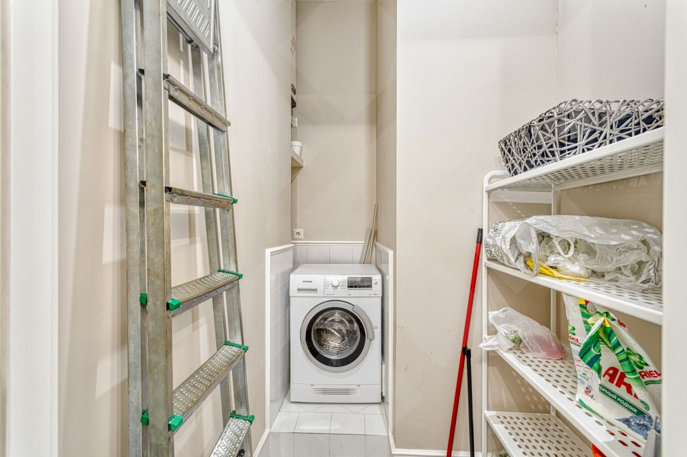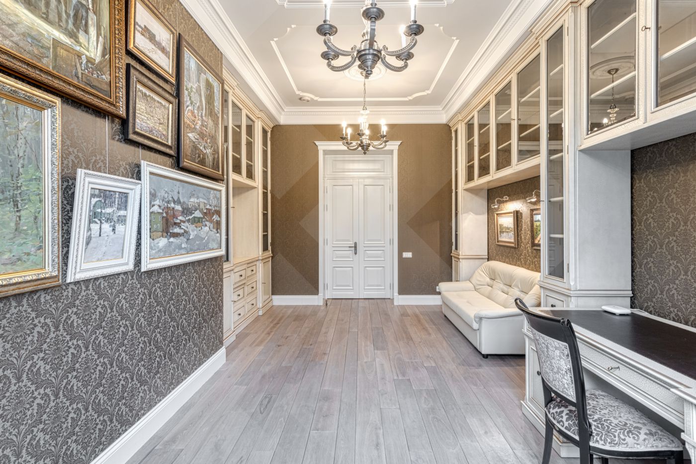 Благодаря правильной геометрической форме комнаты спланированы таким образом, что ни один метр не остался без внимания: функциональная кухня, просторная гостиная комната с выделенной обеденной зоной, три изолированных спальных комнаты, две из которых с собственным с/у и гардеробной комнатой, кабинет с выходом на балкон, гостевой санузел и постирочная комната. Высокие потолки дарят ощущение «воздуха» и пространства.