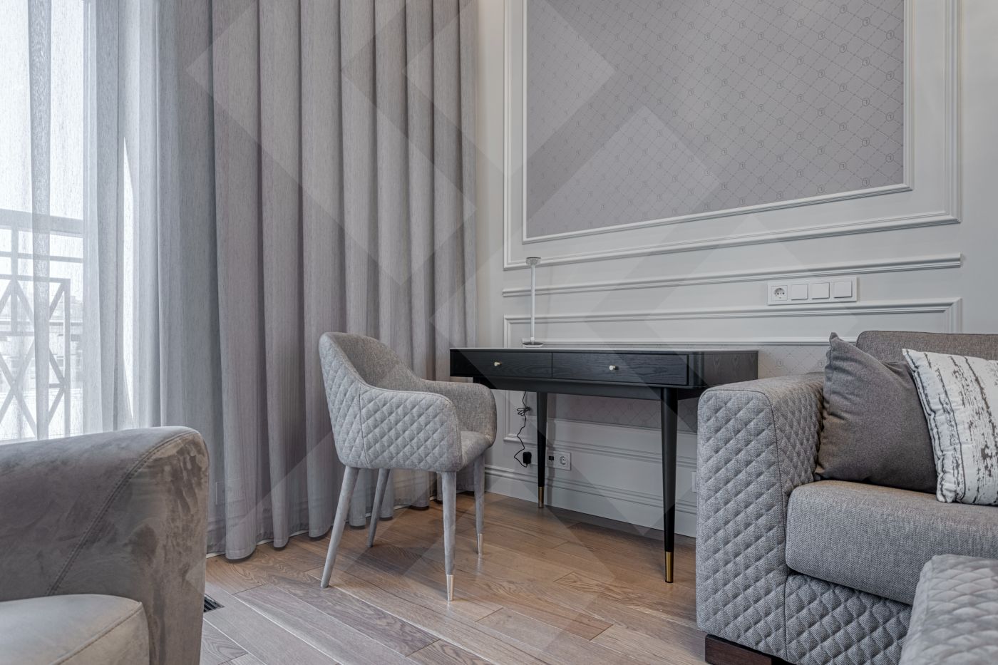 Планировка апартамента: гостиная-кухня, спальня с гардеробной и санузлом (ванна и душевая); кабинет (или еще одна спальня) с санузлом. Выполнен дизайнерский ремонт ремонт. Центральная система кондиционирования, полы с подогревом. Бытовая техника от ведущих мировых производителей стиральная машина с сушкой, индукционная варочная панель, телевизор 85 дюймов, домашний кинотеатр, и прочее. Машино-место в подземном паркинге.