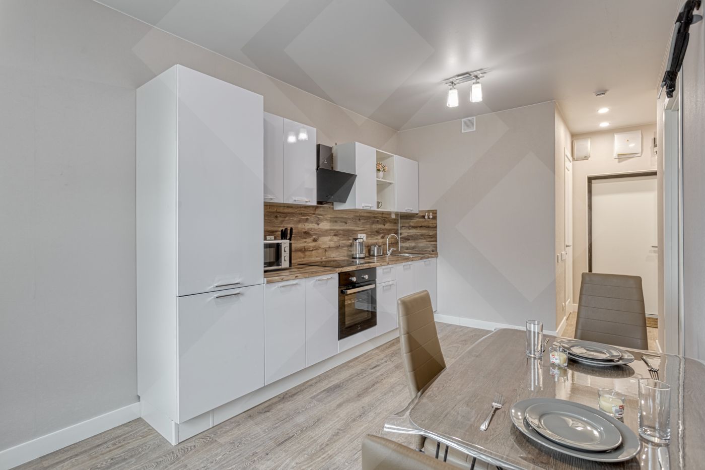 Кухонный гарнитур с духовым шкафом и варочной индукционная поверхностью, стиральная машина с сушкой, посудомоечная машина, холодильник.