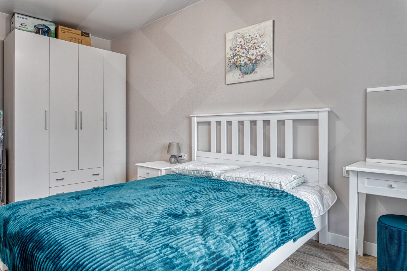 Двуспальная кровать 180x200, шкафы.