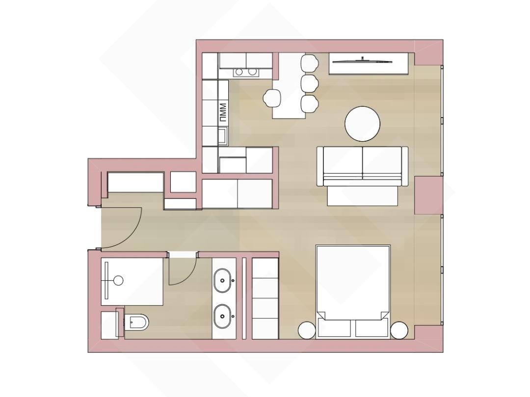 Планировка грамотно разделяет спальную зону и кухню-гостиную, создавая комфортные условия для отдыха и повседневных дел. В интерьере использованы современные дизайнерские решения, которые сочетают эстетику и практичность.