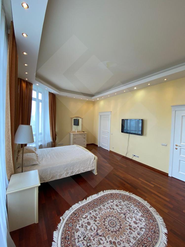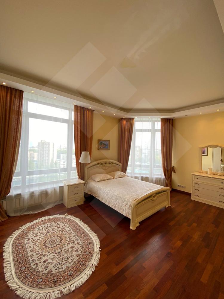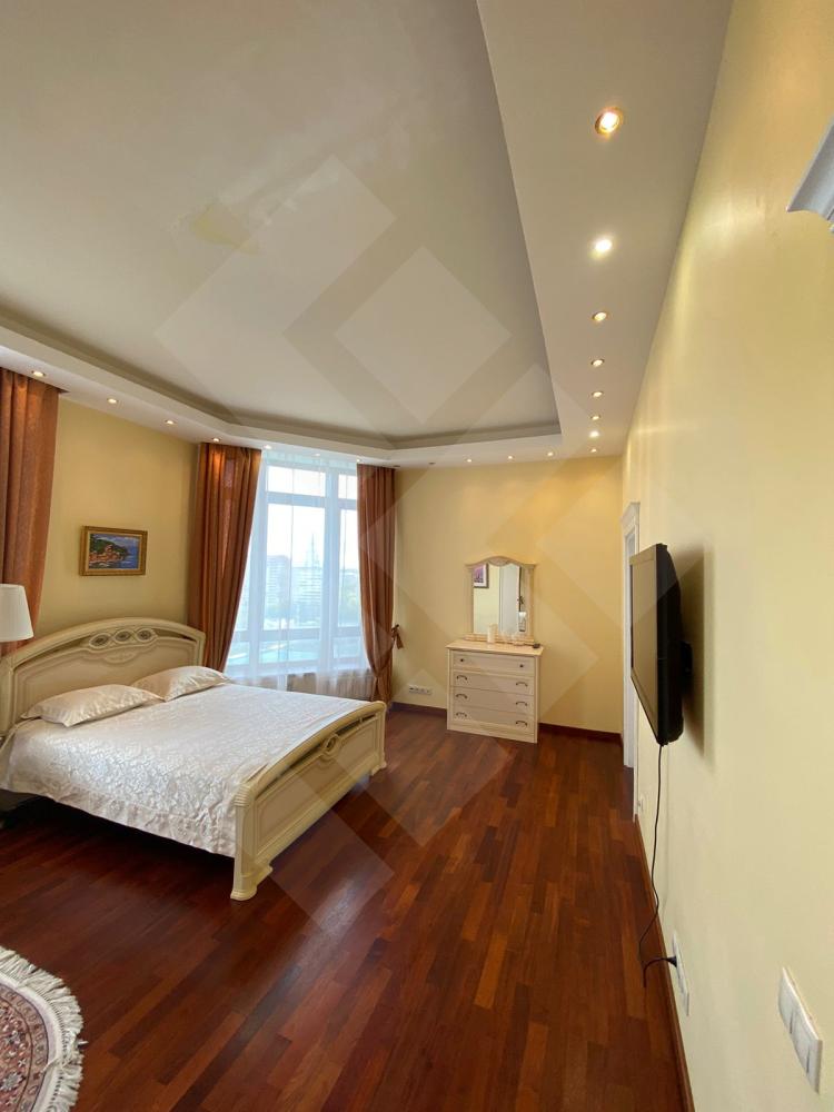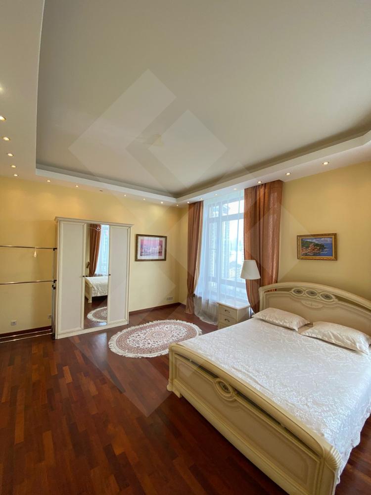 Просторный зал, совмещенный с кухней, просторная светлая спальня, 2 санузла, панорамные окна. Ремонт в классическом стиле. На полу паркет - красное дерево.
