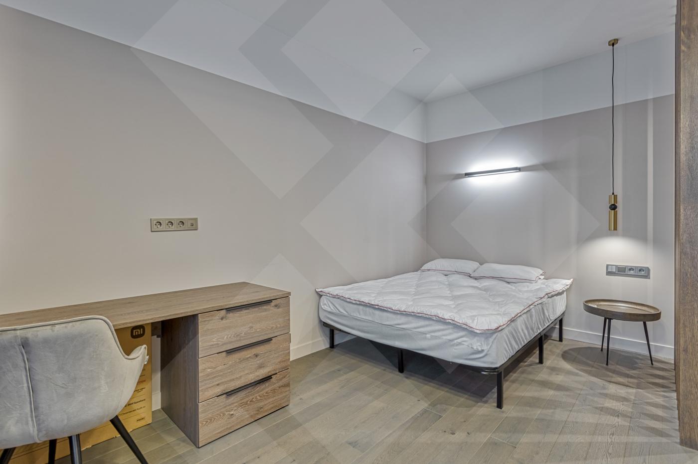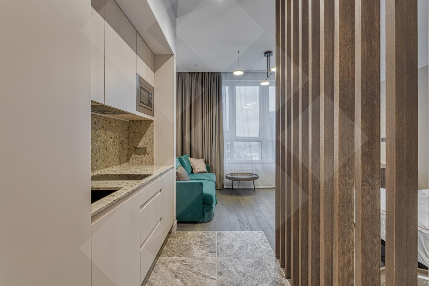 Студия меблирована и оснащена всей необходимой бытовой техникой. При входе встроеный шкаф с достаточным местом для хранения.