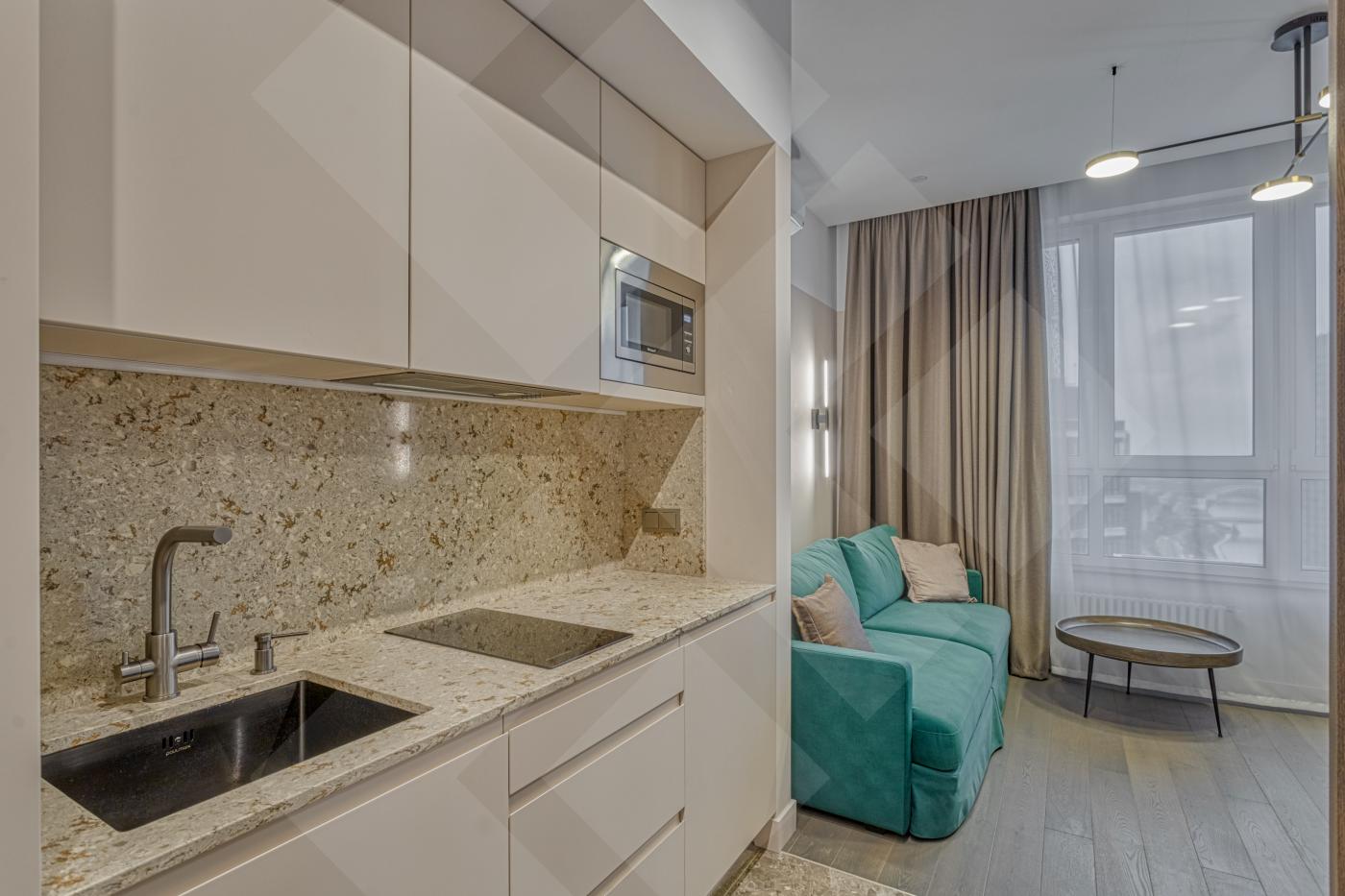 В зоне кухни: варочная поверхность Kuppersberg, вытяжка, холодильник, микроволновая печь, чайник Tefal.