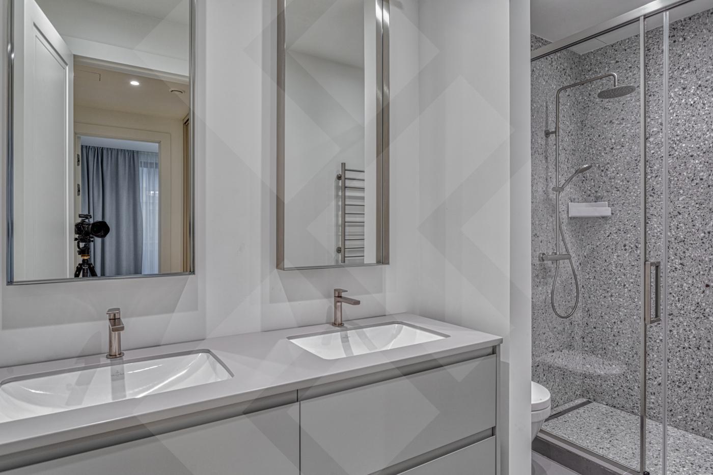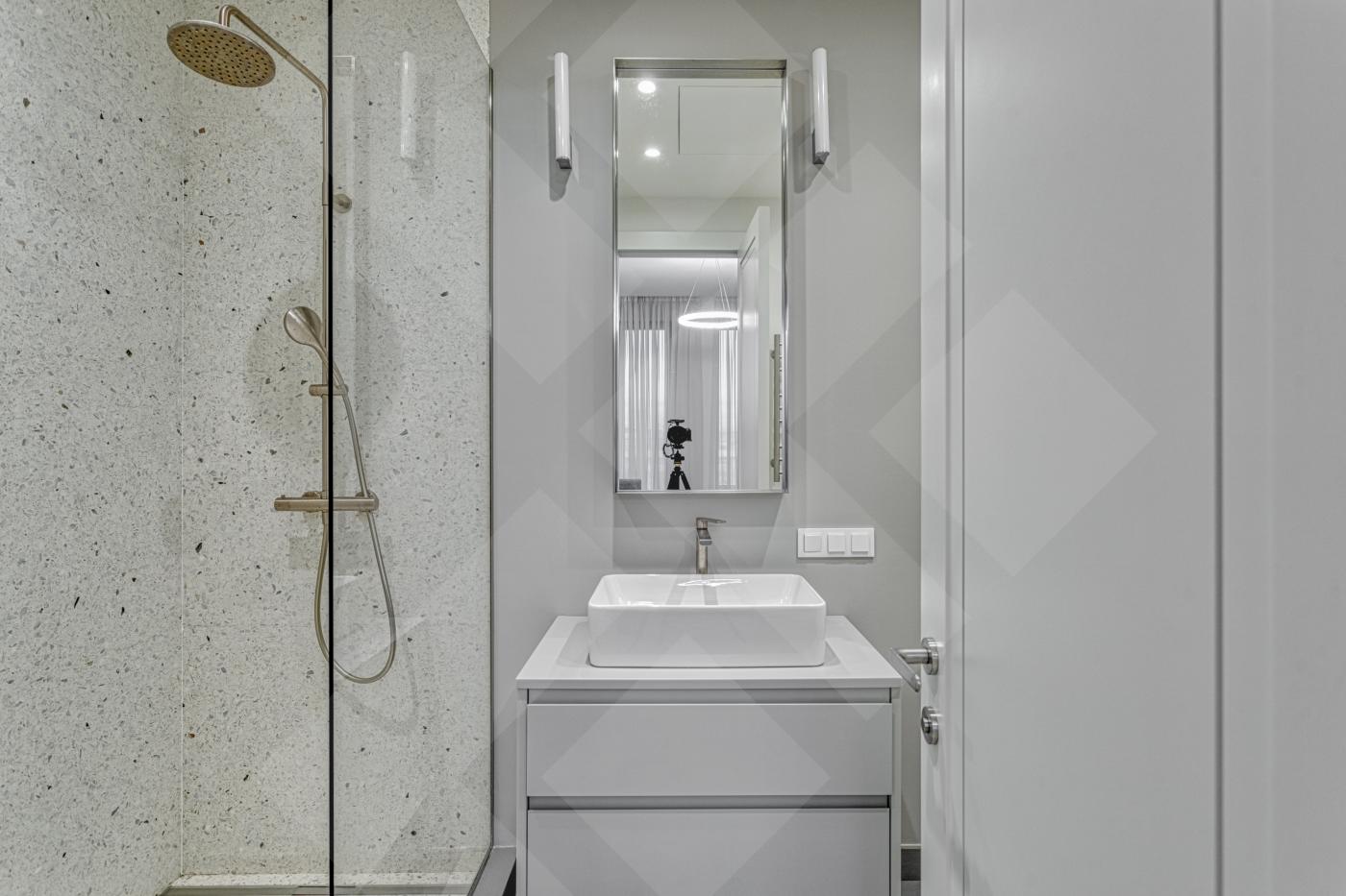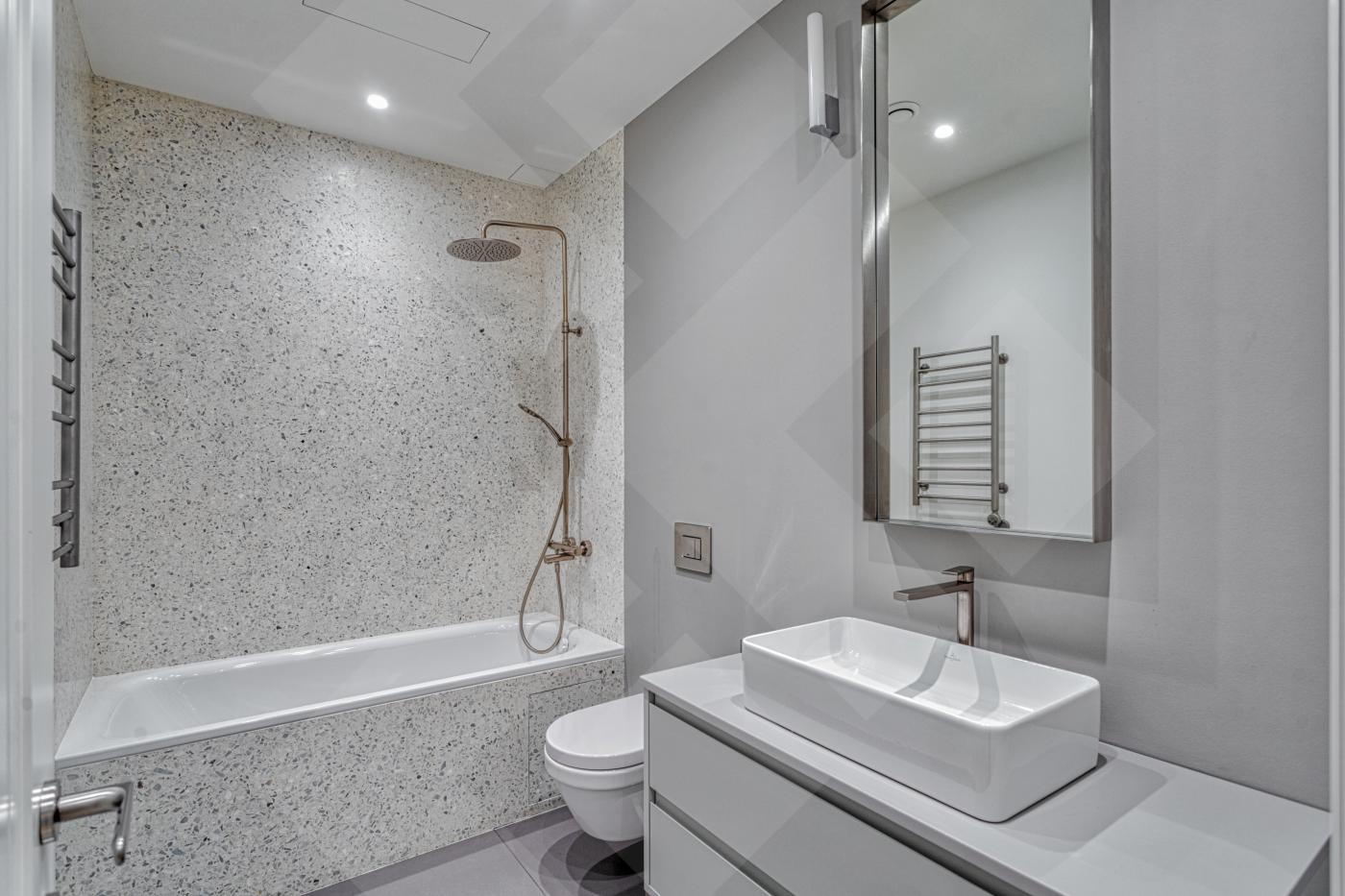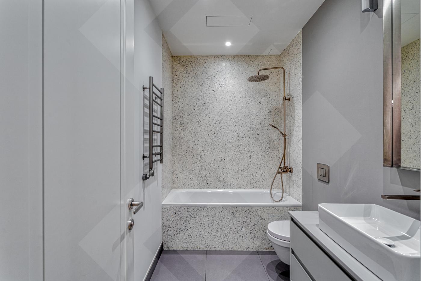 Санузлы облицованы керамогранитом и бетонной плиткой Терраццо. Сантехника марки Villeroy&Boch.