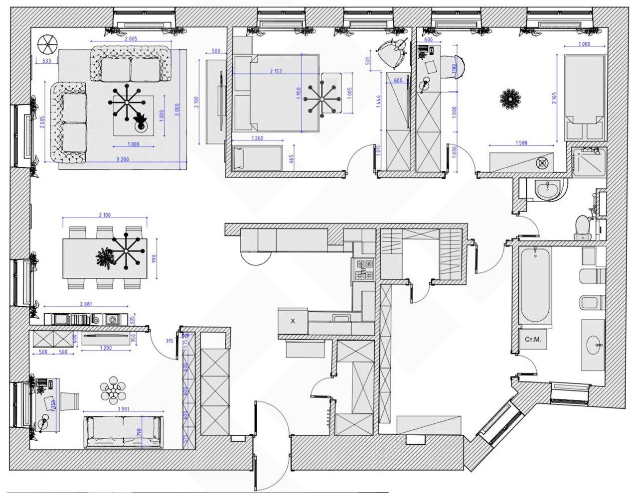 Планировка: 4 изолированные комнаты, гардеробная, 2 с/у ( с ванной и душевой кабиной), гостиная с обеденной зоной, кухня.