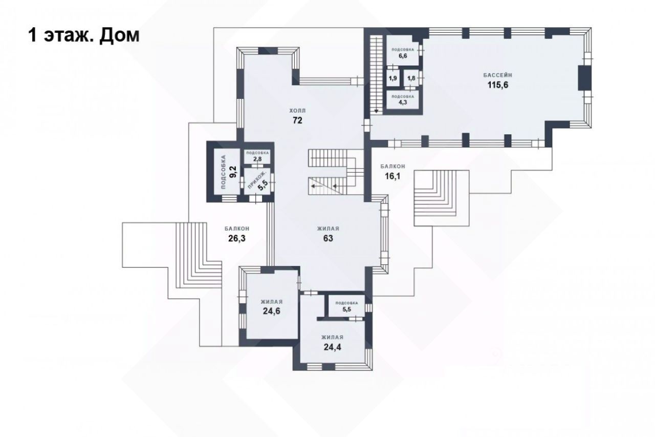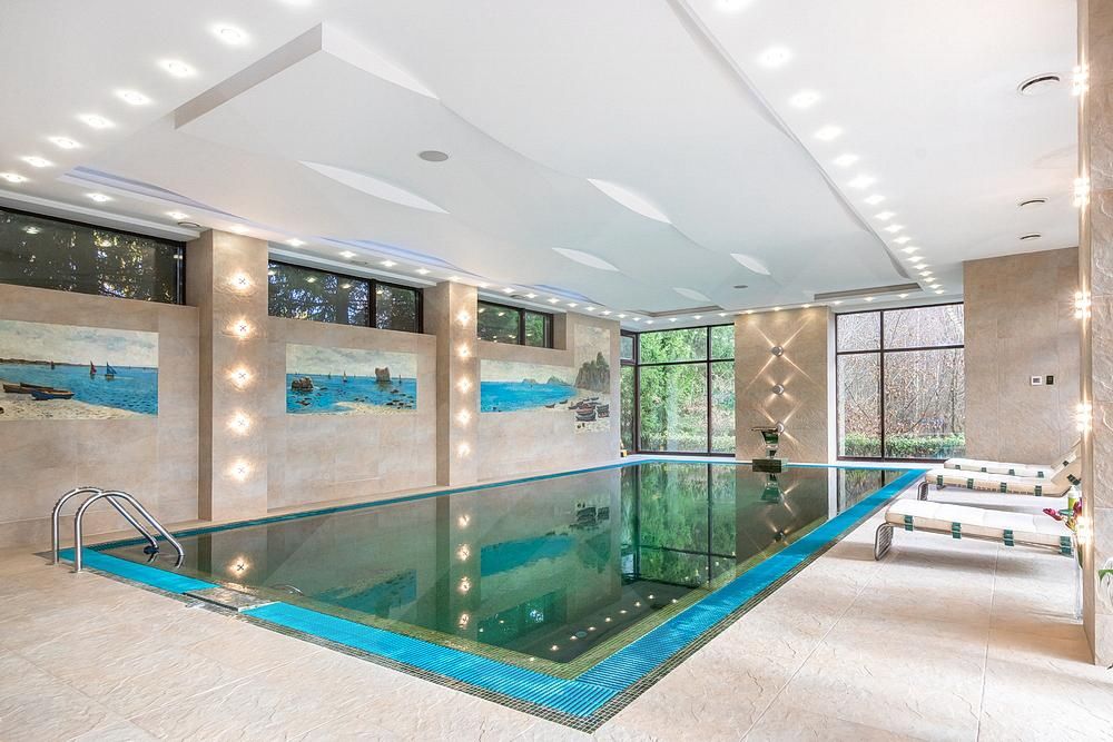 1 этаж: спальня с ванной комнатой, кабинет-библиотека, каминный зал, бассейн, сауна, ванная комната, раздевалка, спортзал, ванная комната;