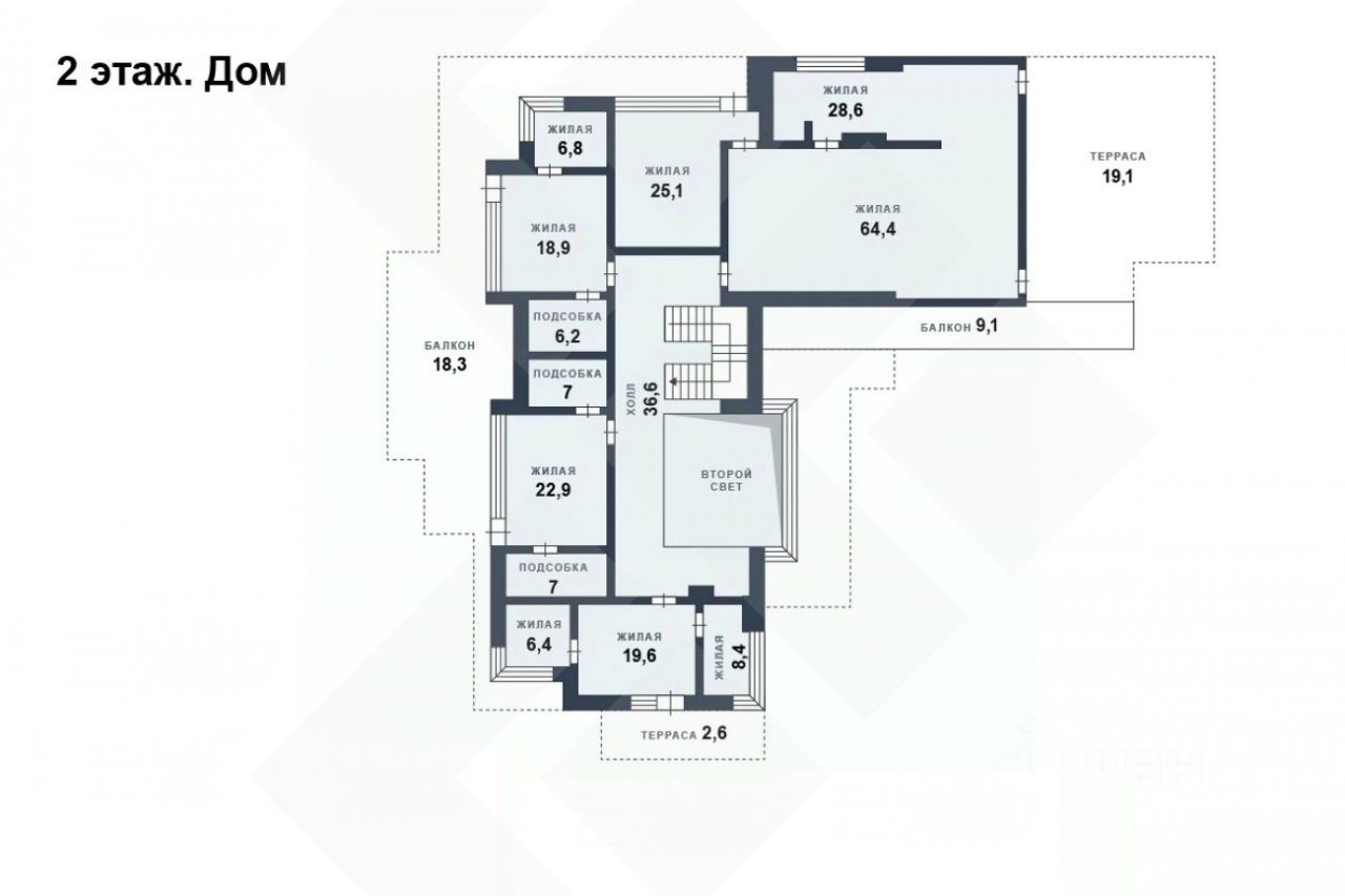 2 этаж: 3 спальни с ванными и гардеробными комнатами, хозяйская спальня имеет зимний сад и отдельные террасы, из всех помещений выходы на круговой балкон.