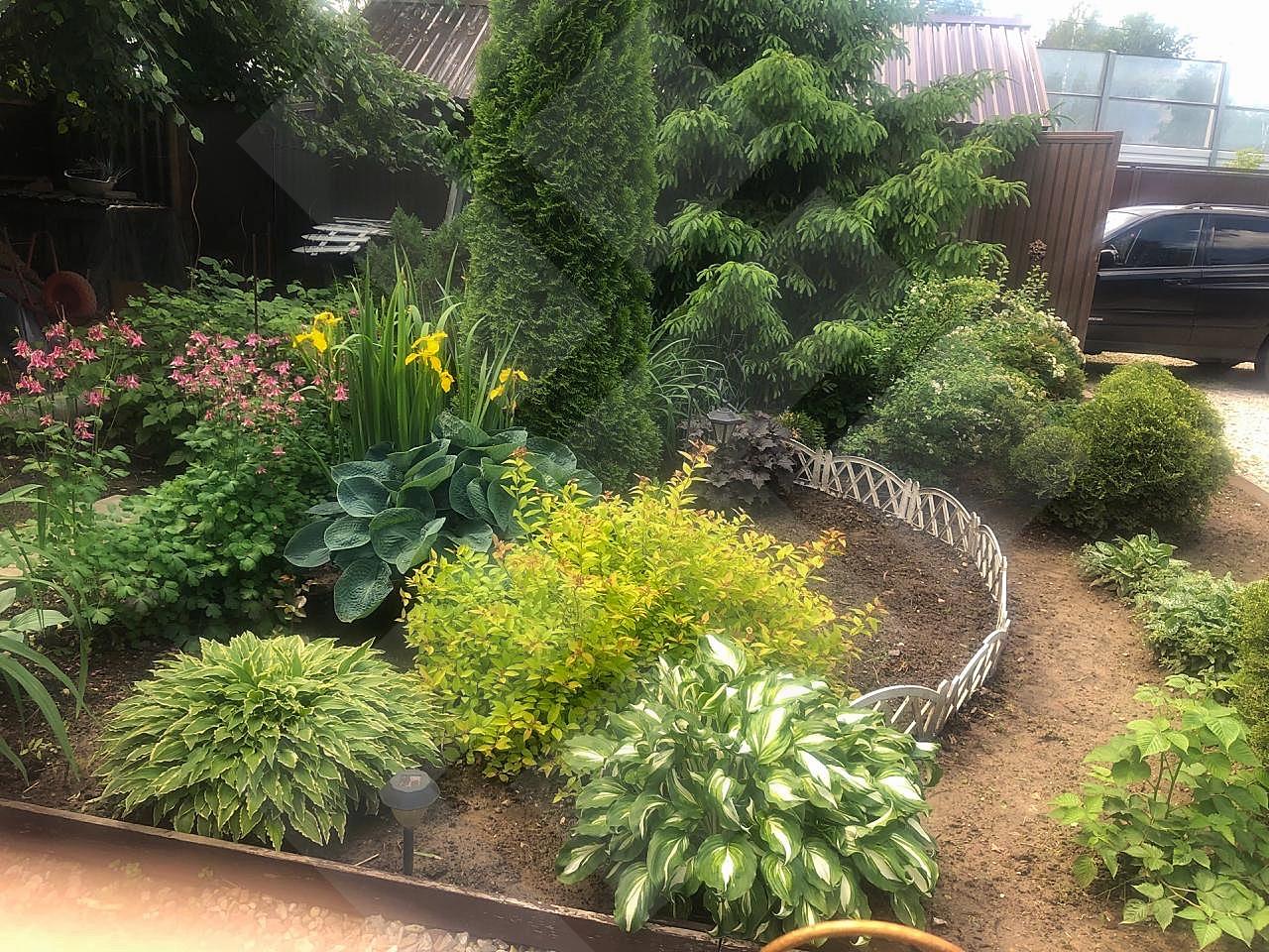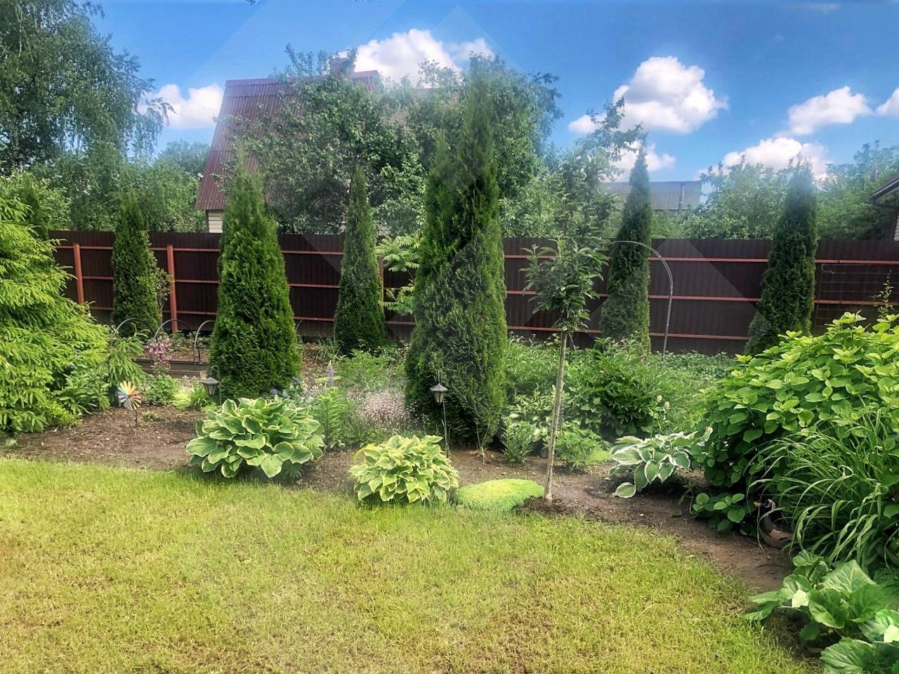 -Участок: На участке высажены плодовые деревья (яблони) и кустарники (ежевика, смородина, клубника, малина, голубика), также множество роз, гортензий и туи.