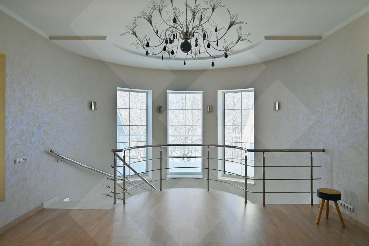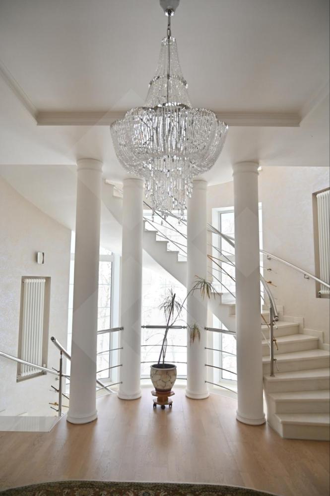 Фасад дома стилизован архитектурными деталями: колоннами, ротондой, усадебным декором, круговыми лестницами. В доме площадью 797 кв. м. 4 этажа и лифт для комфортного перемещения между ними. Всего 8 спален - из них 5 с собственной гардеробной и санузлом. Дом располагается на лесном участке с березовой рощей и выходом к реке Лубянка.