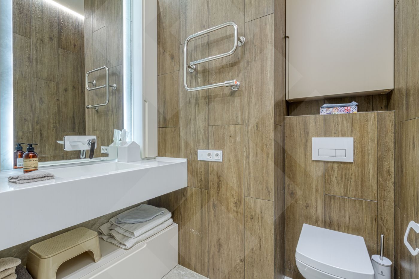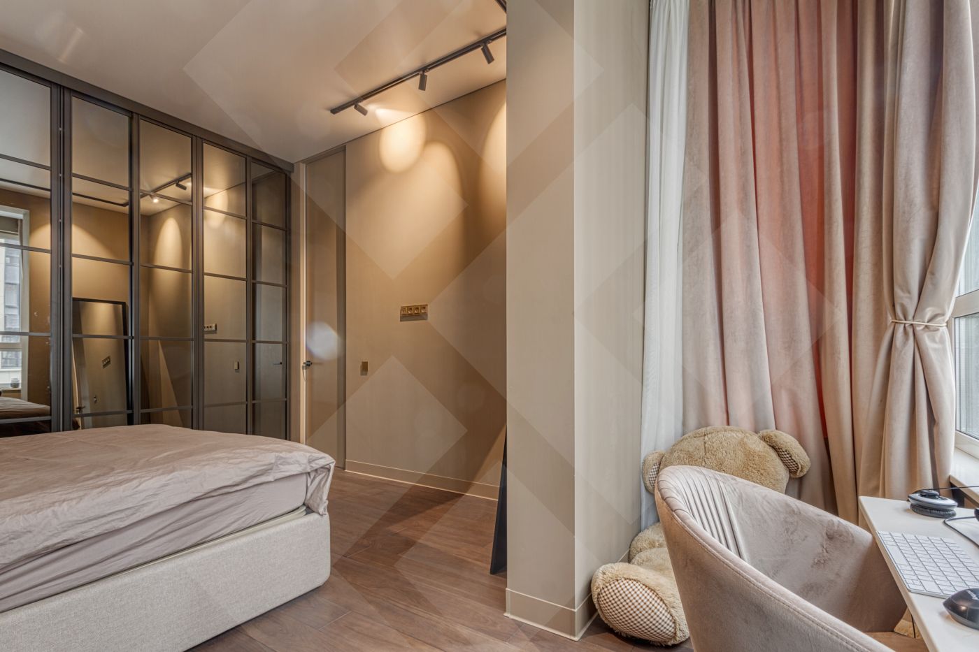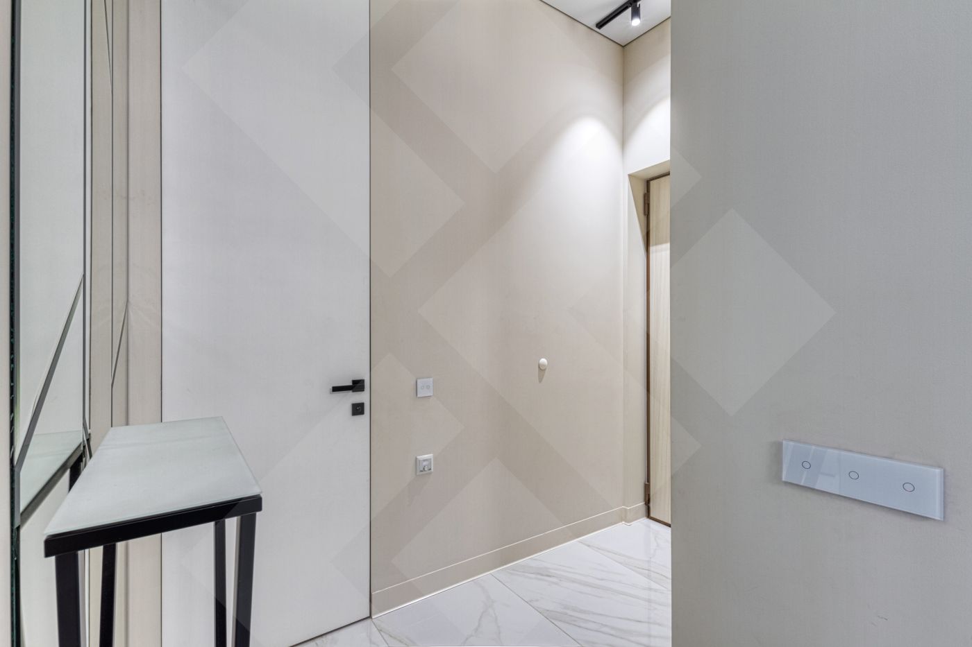 В квартире установлены сенсорные выключатели для многоуровнего света, в кухонной зоне стены выполнены из широкоформатного керамогранита. Вся техника на кухне немецкая. В прихожей, гостиной и кухне полы выполнены из керамогранита, полы с подогревом. Вся мебель в квартире выполнена под заказ, установлены двери увеличенной площади скрытого монтажа. В мастер спальне имеется полноценная оснащенная гардеробная комната. В гостиной установлен кондиционер.