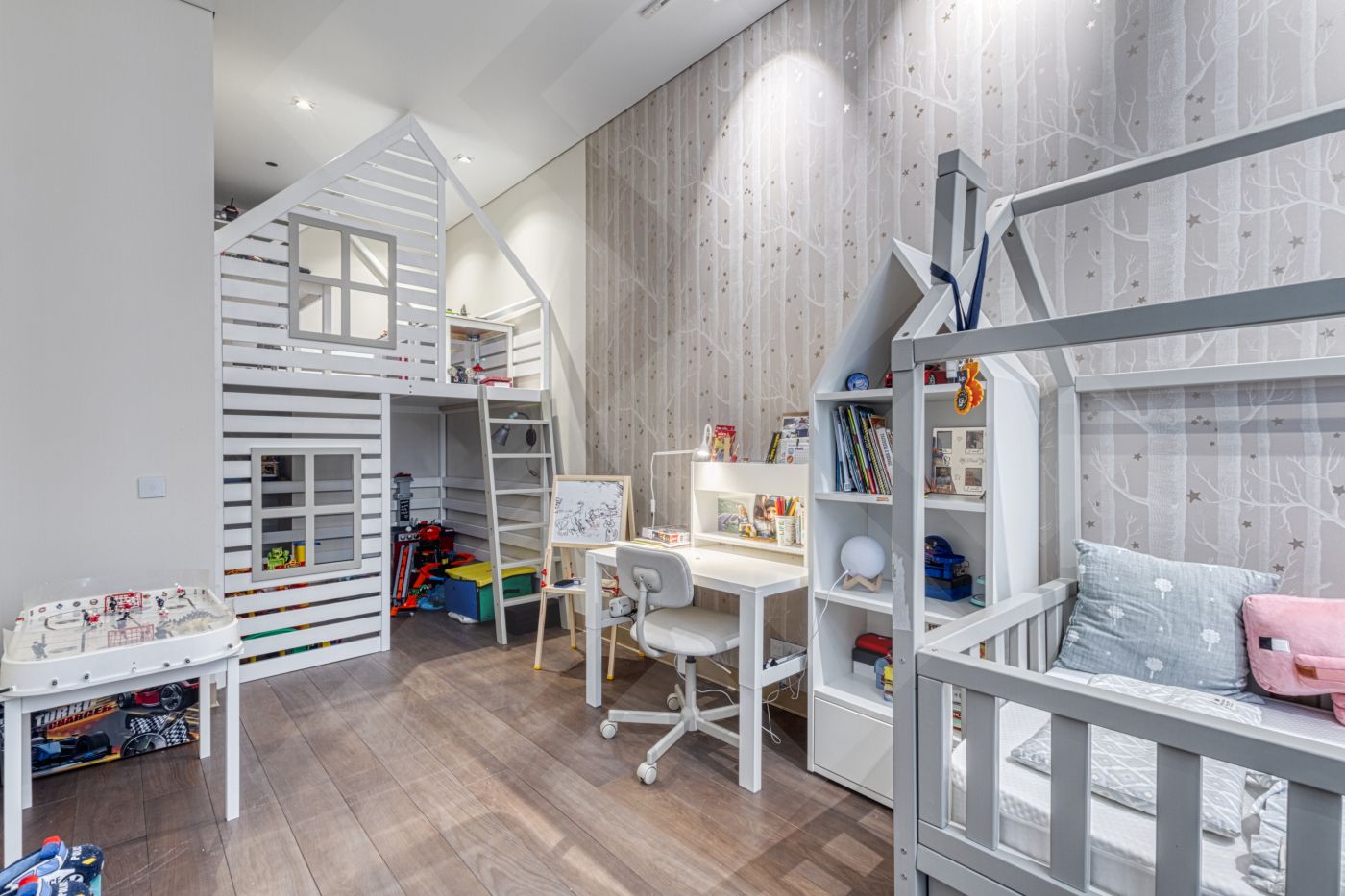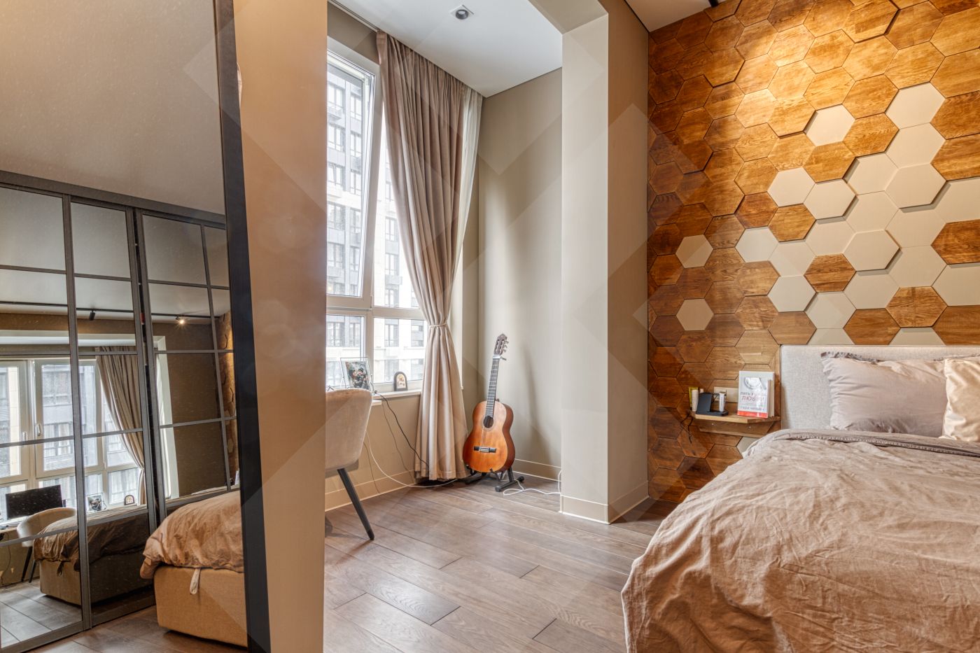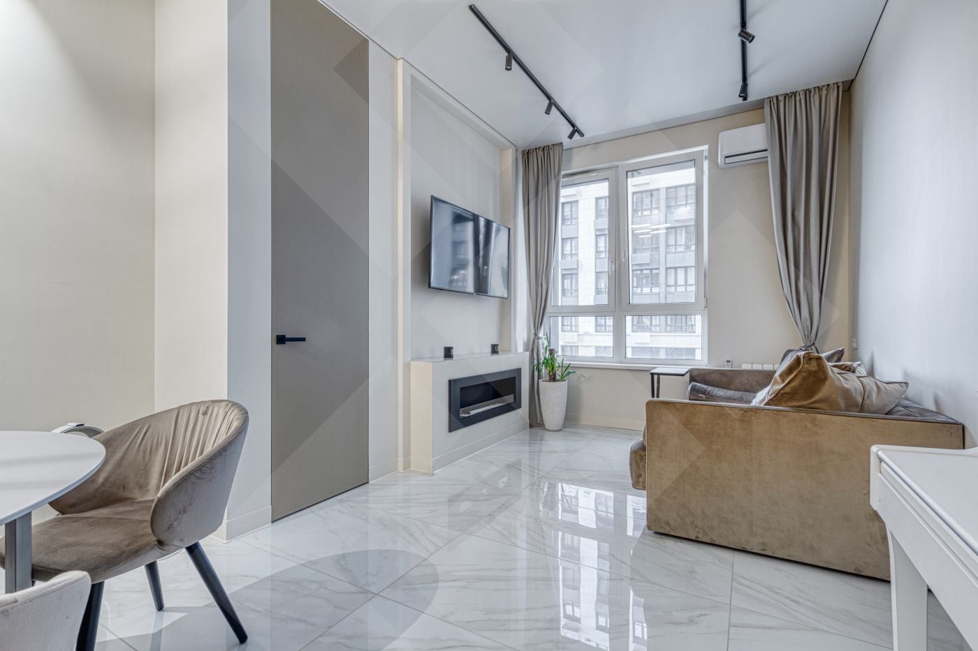 В квартире установлены сенсорные выключатели для многоуровнего света, в кухонной зоне стены выполнены из широкоформатного керамогранита. Вся техника на кухне немецкая. В прихожей, гостиной и кухне полы выполнены из керамогранита, полы с подогревом. Вся мебель в квартире выполнена под заказ, установлены двери увеличенной площади скрытого монтажа. В мастер спальне имеется полноценная оснащенная гардеробная комната. В гостиной установлен кондиционер.