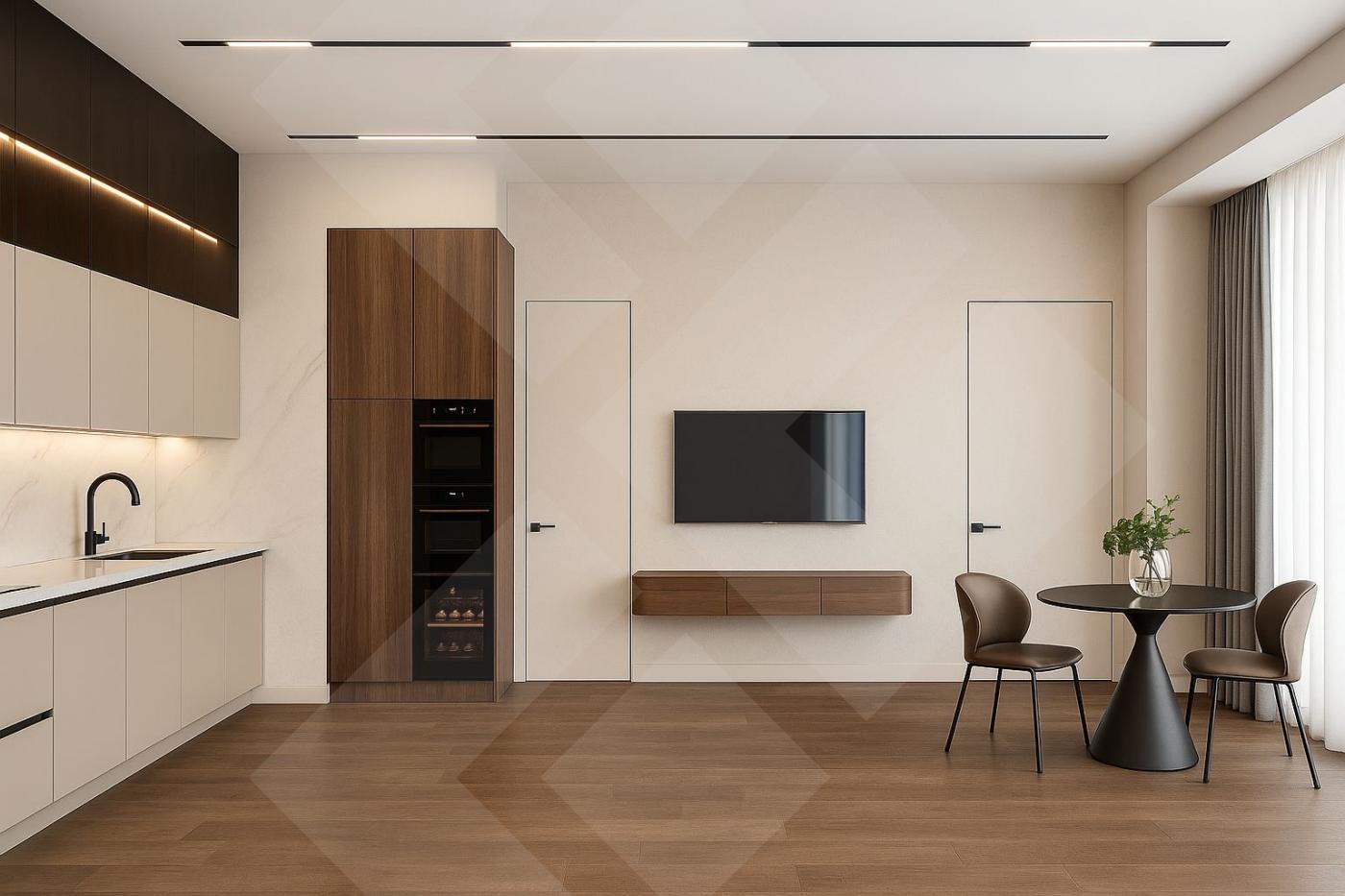 Потолки высотой 3 м. Стены —краска Johnstones, декоративная штукатурка, стеновые панели; полы —кварц-винил и керамогранит,с/у-керамогранит; теневой натяжной потолок системы Krab; двери -invisible, высотой 2,40 м; мойка- Omoikiri, сантехника- Boheme и AM.PM, сталешницы - кварцит; внутрипольные конвекторы, кондиционеры Hisense, Умный дом, биометрический замок на входной двери, встроенный сейф. Различные сценарии освещения и большое количество подсветок делают квартиру еше более привлекательной.