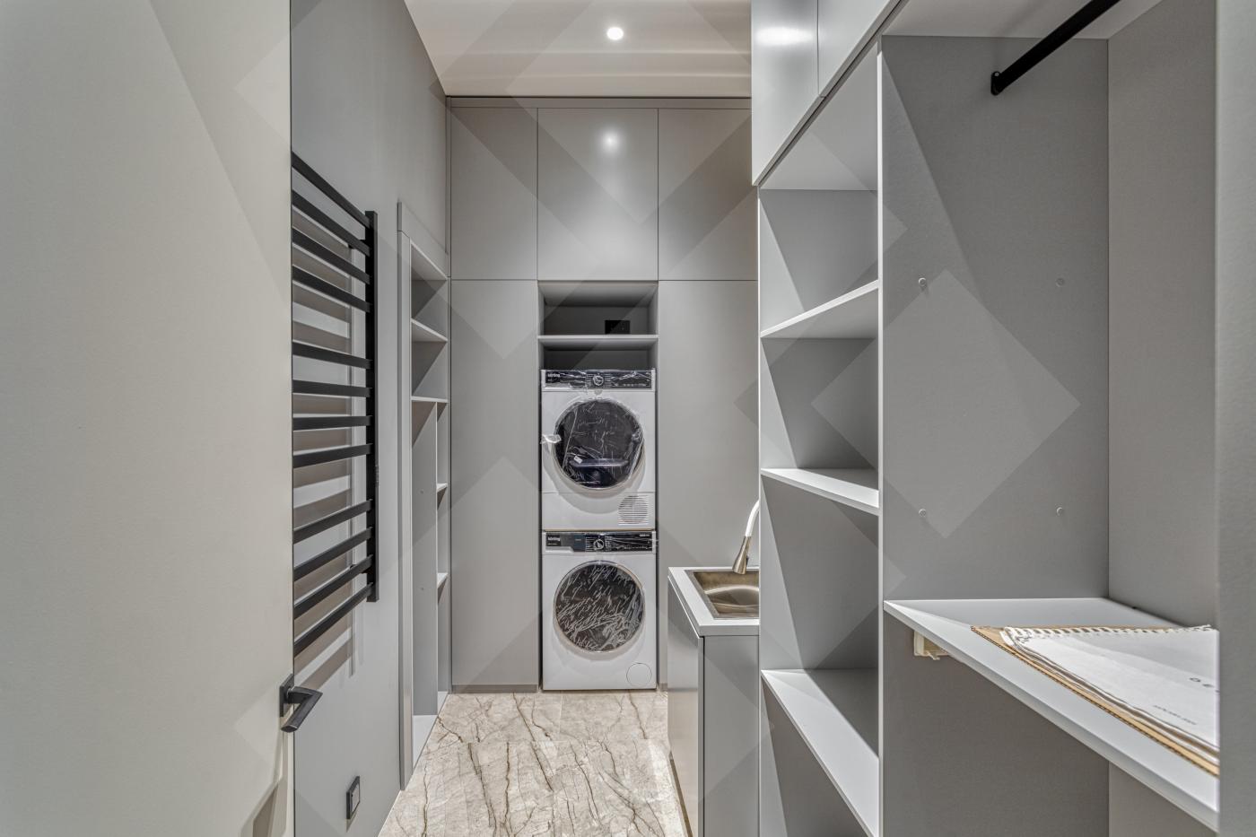 Планировкой предусмотрено: холл, большая гостиная, кухня, спальня/детская, мастер-спальня с гардеробной комнатой, ванная комната с ванной и душевой кабиной, кабинет/третья спальня, гостевой санузел, постирочная, большая гардеробная комната с окнами. Установлена бытовая техника Korting (Германия): духовой шкаф, варочная панель, вытяжка, посудомоечная машина, холодильник, морозильник, стиральная машина, сушильная машина. Сантехника: Boheme, Timo Tome . На полу инженерная доска Finex, керамогранит Italon. Кондиционеры во всех комнатах.