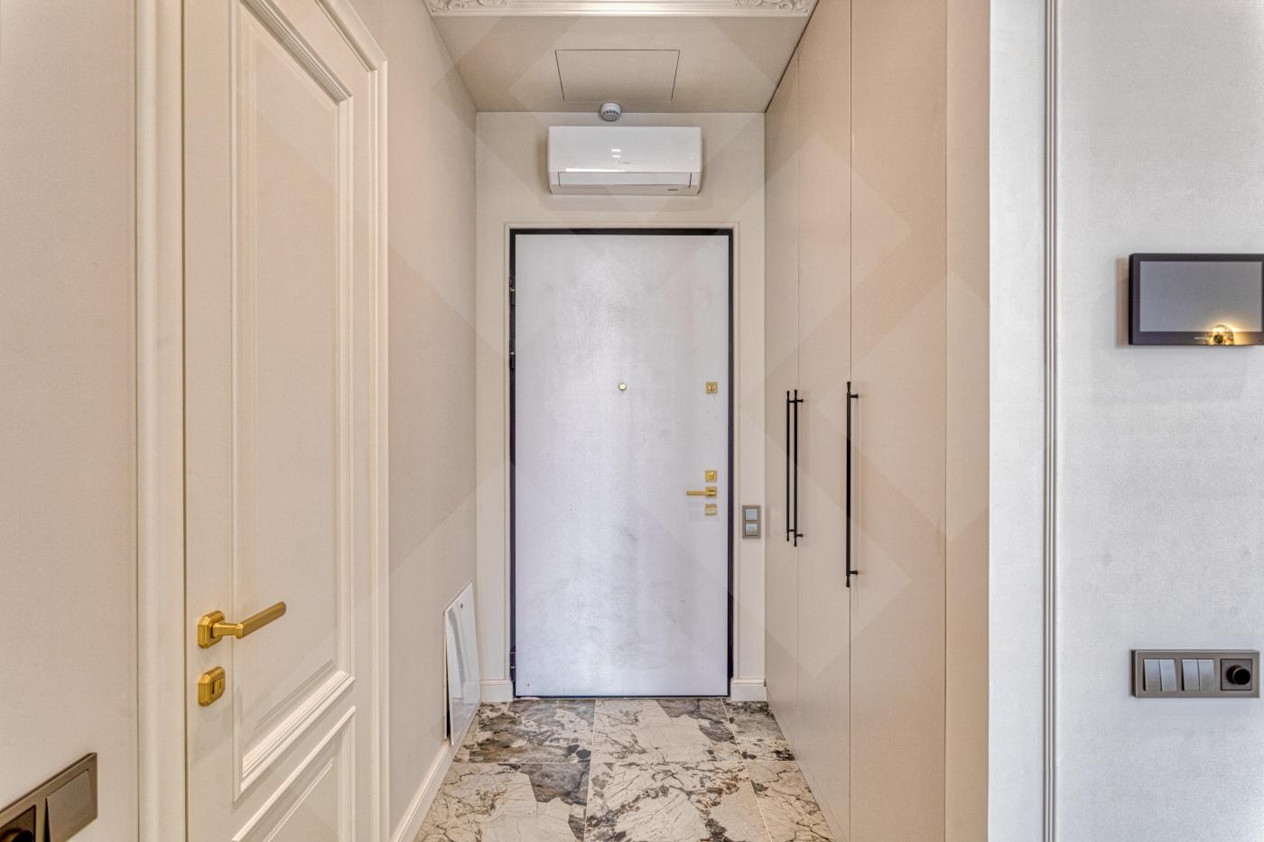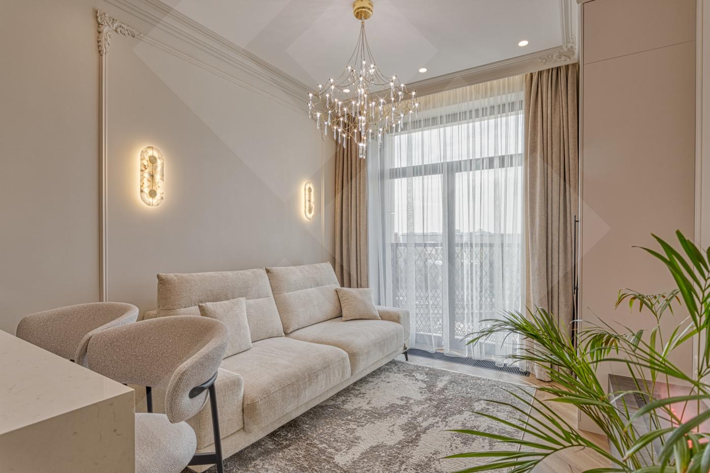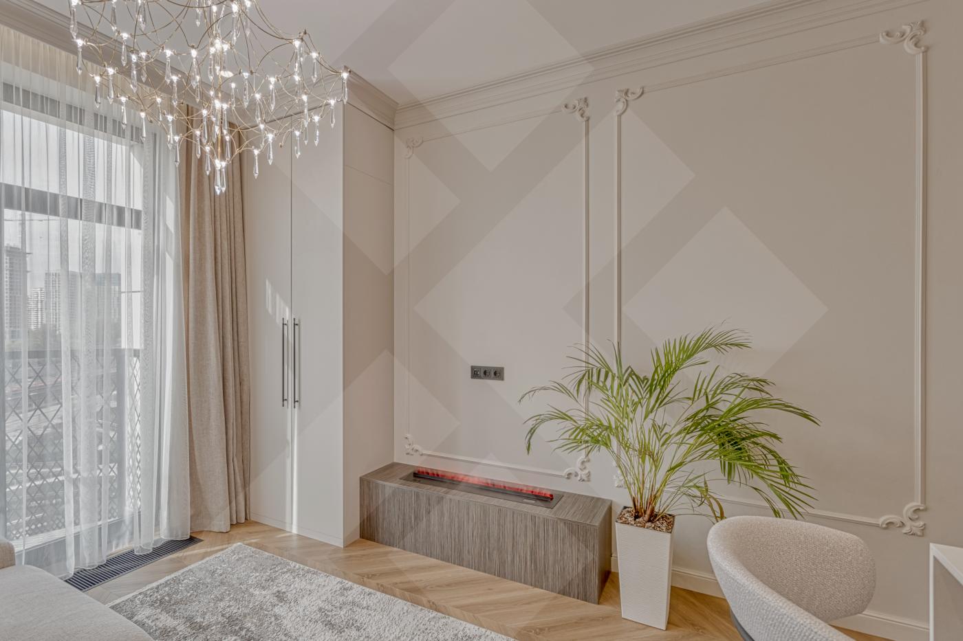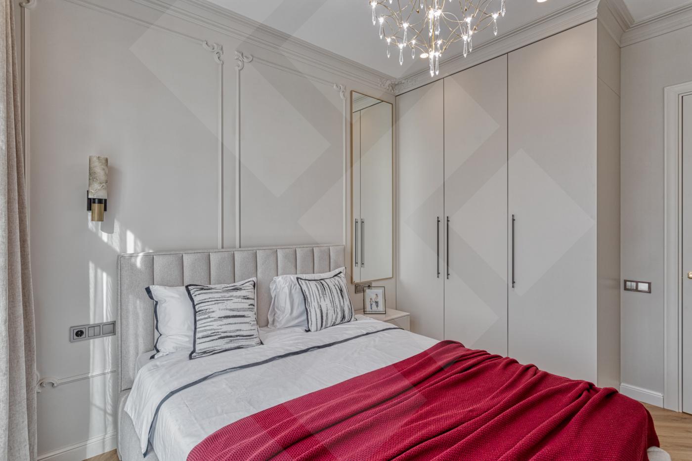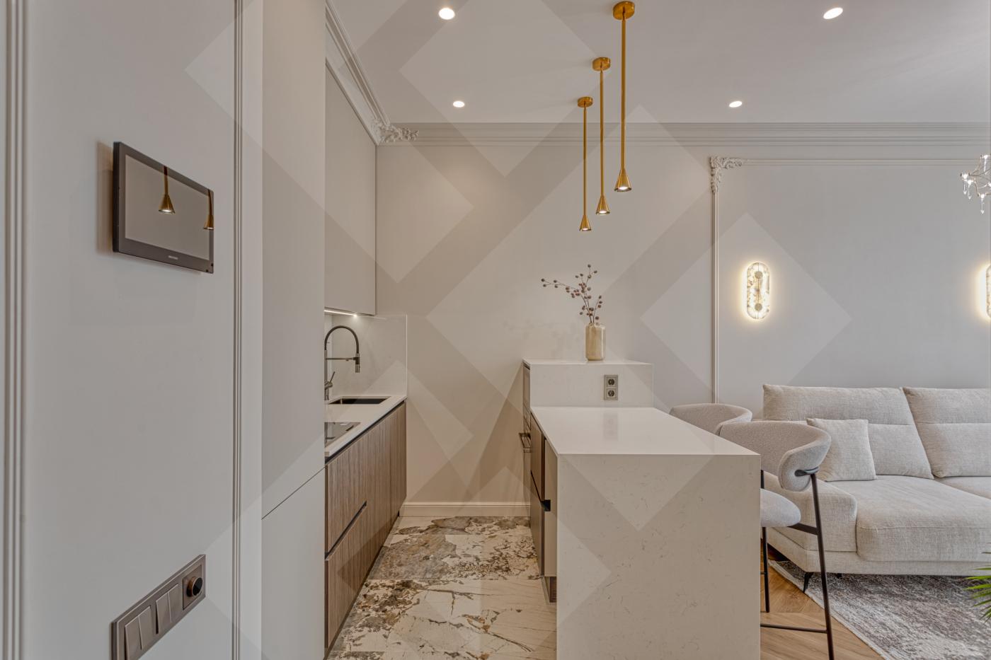 Квартира полностью меблирована и укомплектована бытовой техникой Bosch. Вся мебель выполнена на заказ, кухонные столешницы — из кварцевого агломерата.