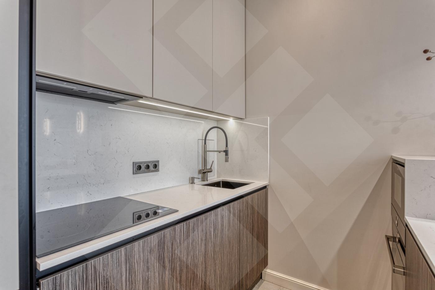 Квартира полностью меблирована и укомплектована бытовой техникой Bosch. Вся мебель выполнена на заказ, кухонные столешницы — из кварцевого агломерата.