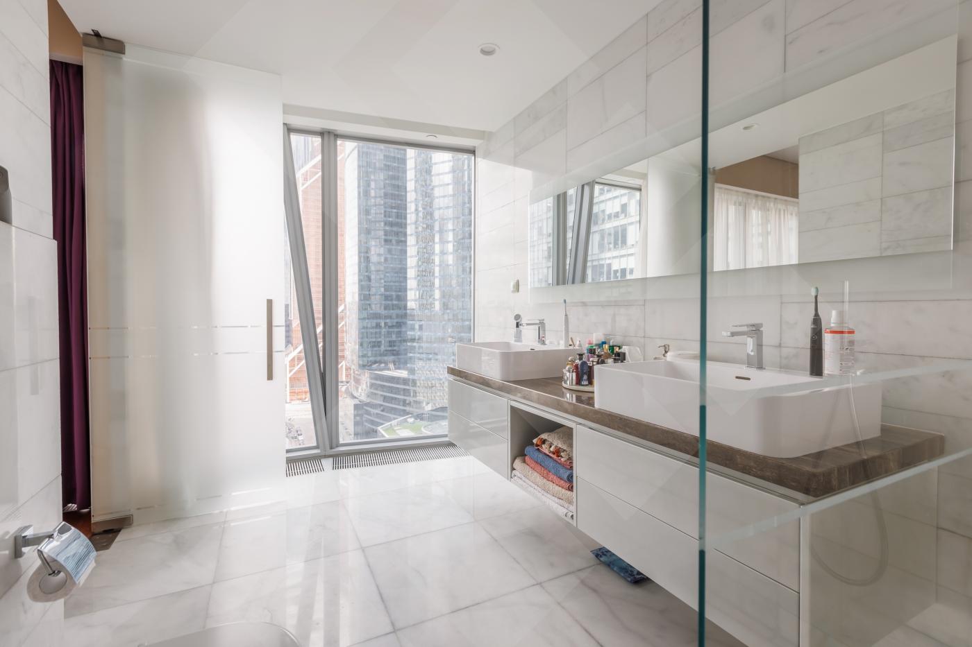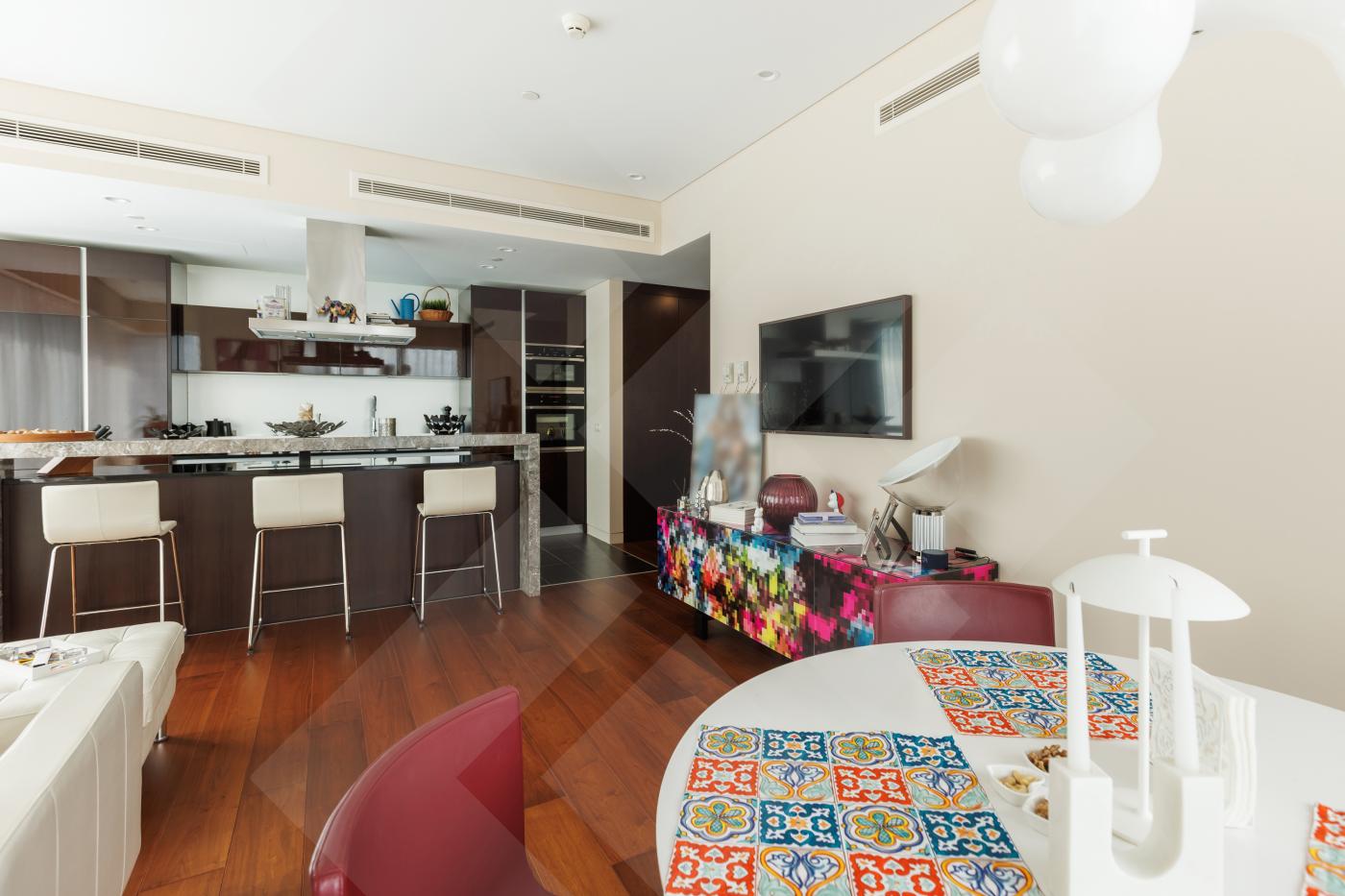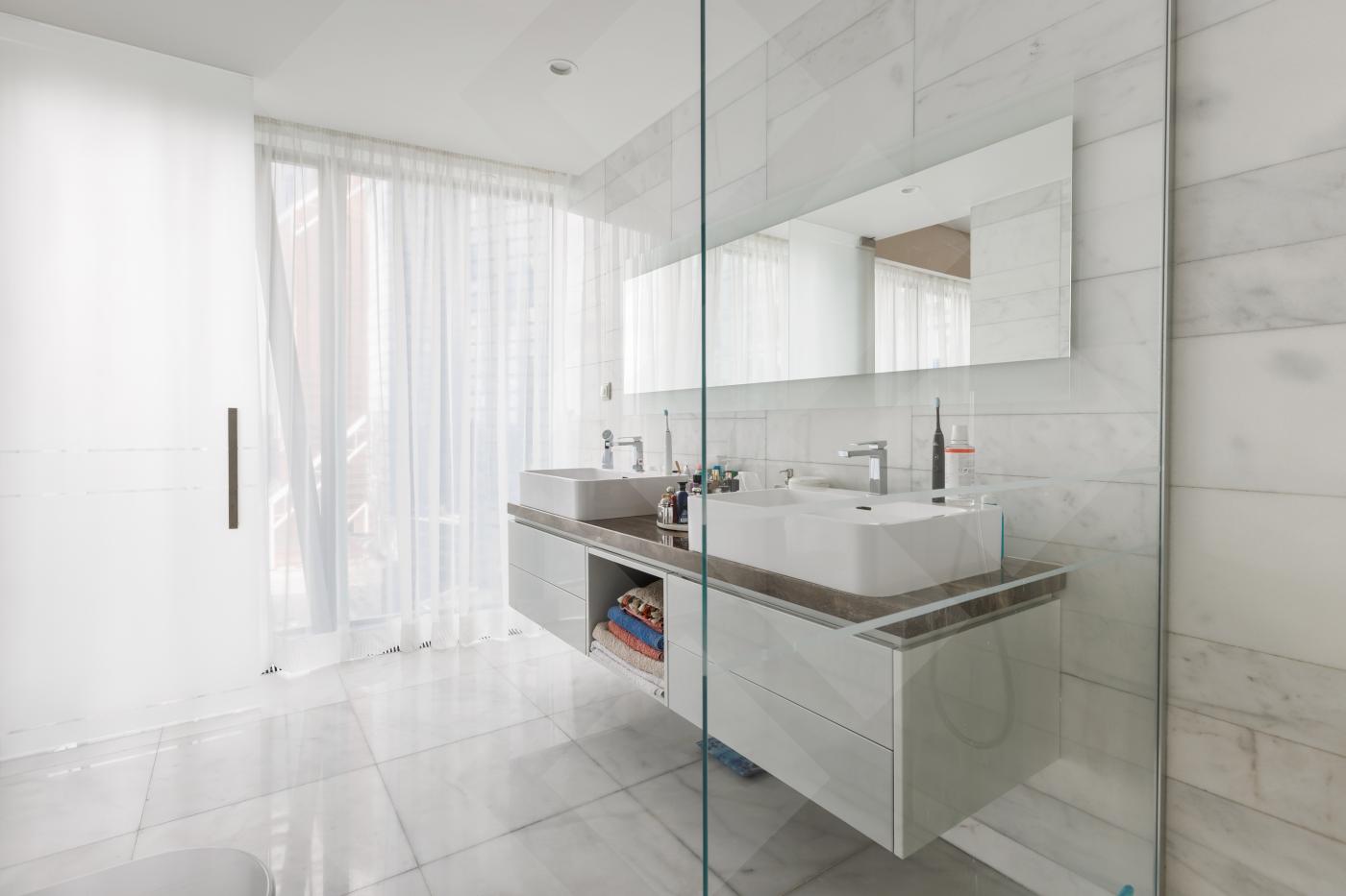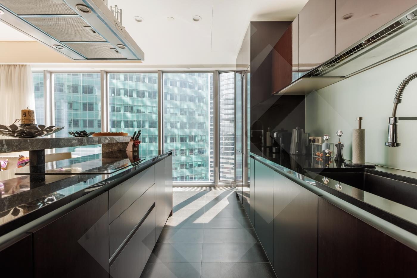 Планировкой пространство выглядит следующим образом: угловая гостиная совмещенная с кухней, мастер-спальня с панорамной ванной комнатой, холл, гостевой с/у, постирочная. Апартамент наполнен премиальной отделкой и мебелью: кухня RIFRA Италия, сантехника FANTINI Италия, бытовая техника KUPPERSBUSCH Германия, окна SCHUCO. Высота потолков 3м. Приточно-вытяжная система вентиляции и центральное кондиционирование для комфорта проживания.