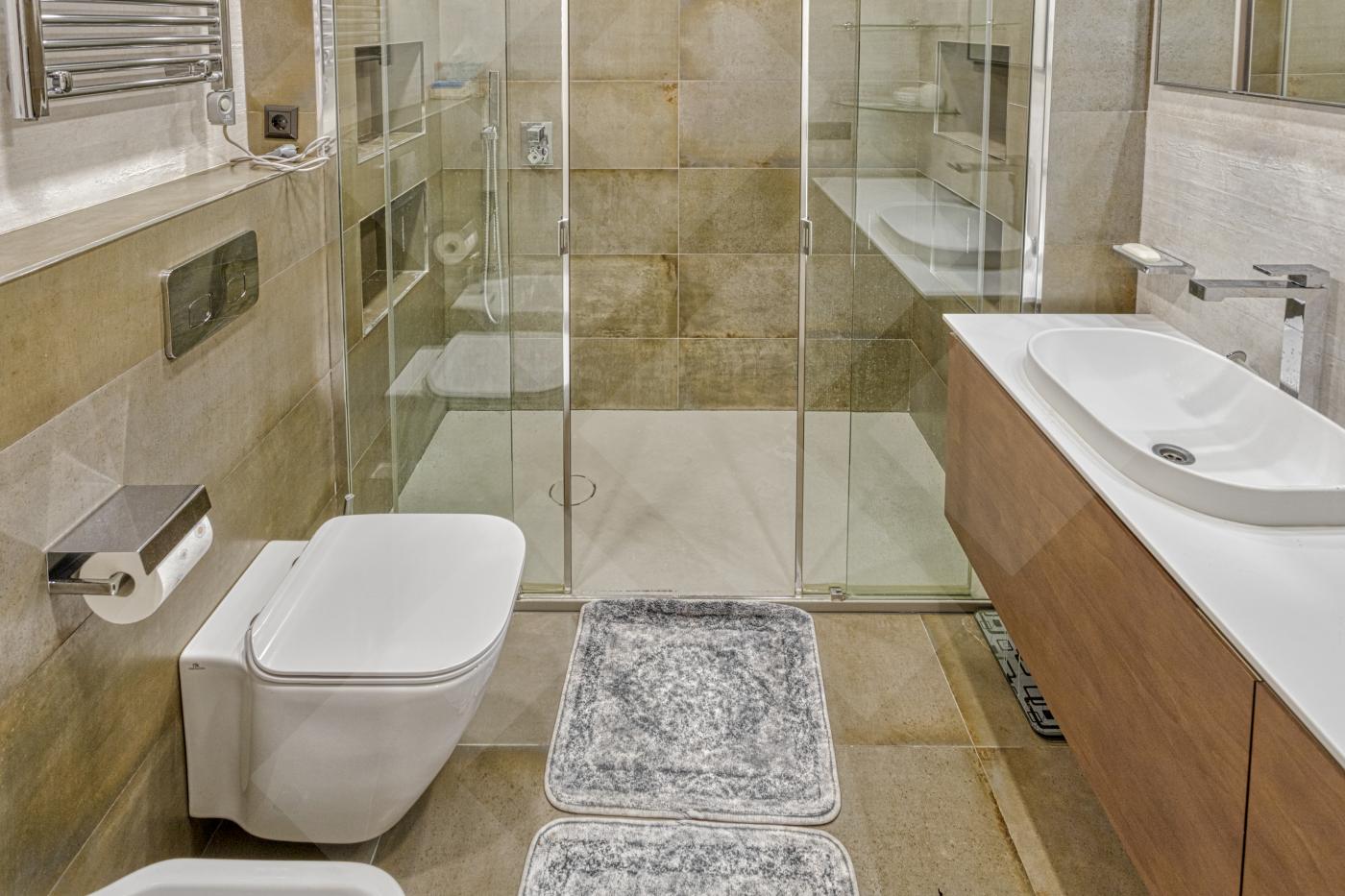 На первом уровне квартиры разместились открытая кухня с барной стойкой и столовой, гостиная со вторым светом и притягательной каминной зоной с естественным освещением через панорамное окно. А кроме того, гардеробная и гостевой санузел. Выход на огромный балкон 12м2.