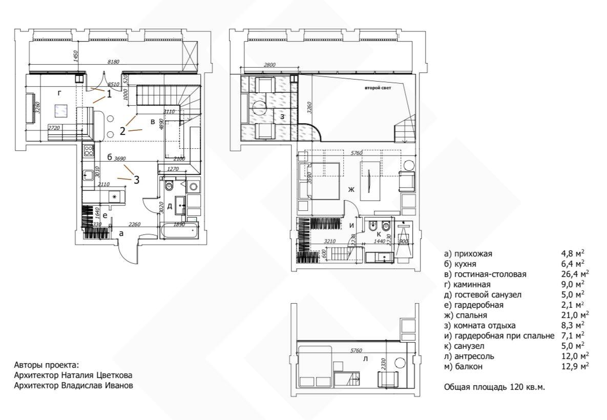 Архитекторы нарастили площадь второго уровня и продлили его площадкой со стеклянным полом, на которой организовали кабинет. Им также удалось устроить небольшую площадку на третьем уровне, куда ведёт лестница из гардеробной. Здесь расположили небольшую гостевую спальню. Отсюда открывается вид на панораму города и на всю квартиру. Квартира получилась гостеприимной и открытой, здесь буквально отовсюду, за исключением санузлов и гардеробных, открывается панорамный вид на центр Москвы.