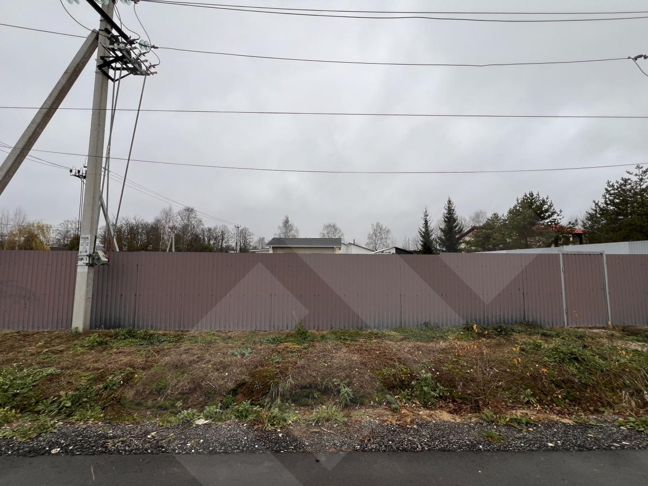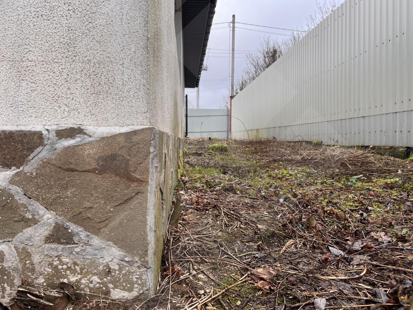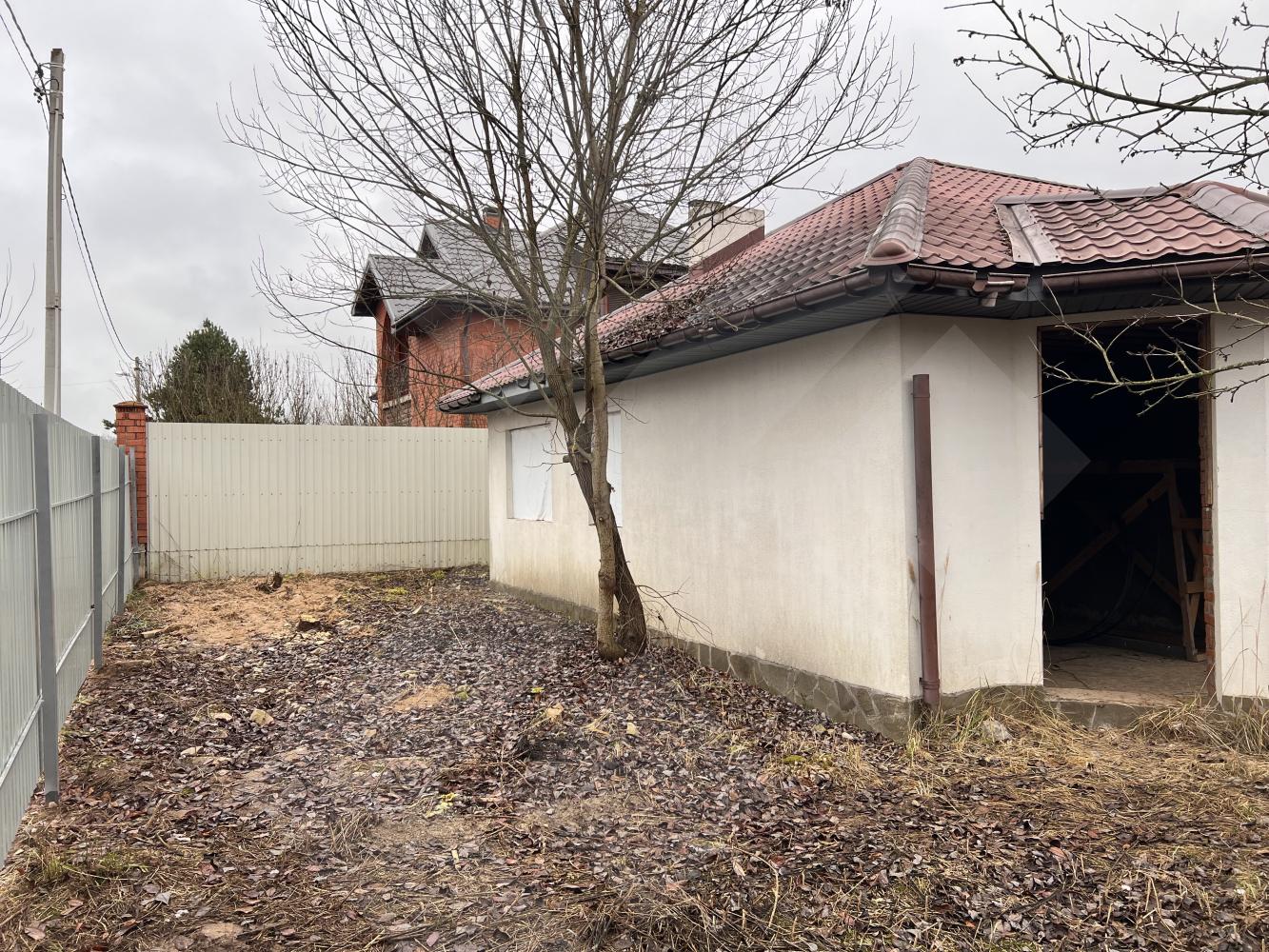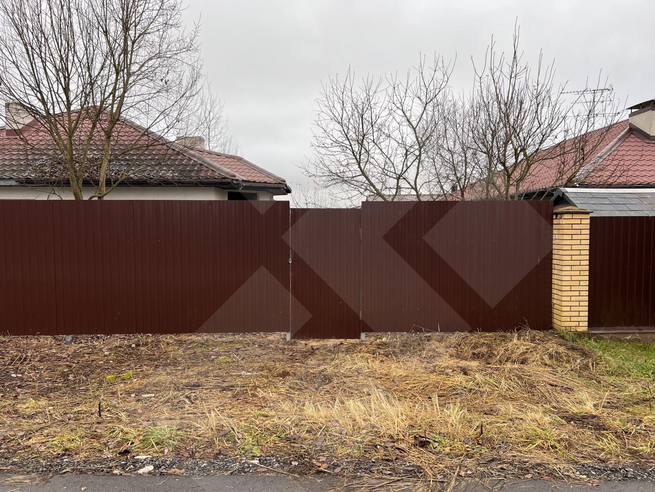 Забор профнастил. Здание на участке материал - газоблоки, крыша черепица.