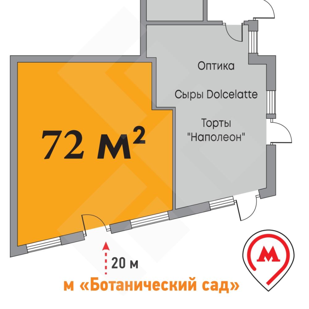 iD 57086 Предлагаю в аренду помещение свободного назначения площадью 72 м2, расположенное на первом этаже ЖК Life-Ботанический. Помещение с отдельным входом, зальной планировки, с витринным остеклением. Все коммуникации в наличии. Электрическая мощность 35 квт. Вывеска. Парковка перед фасадом. Очень интенсивный пешеходный и автомобильный трафик, в 50 м. расположены метро Ботанический сад, станция МЦК Ботанический сад, перехватывающая парковка.