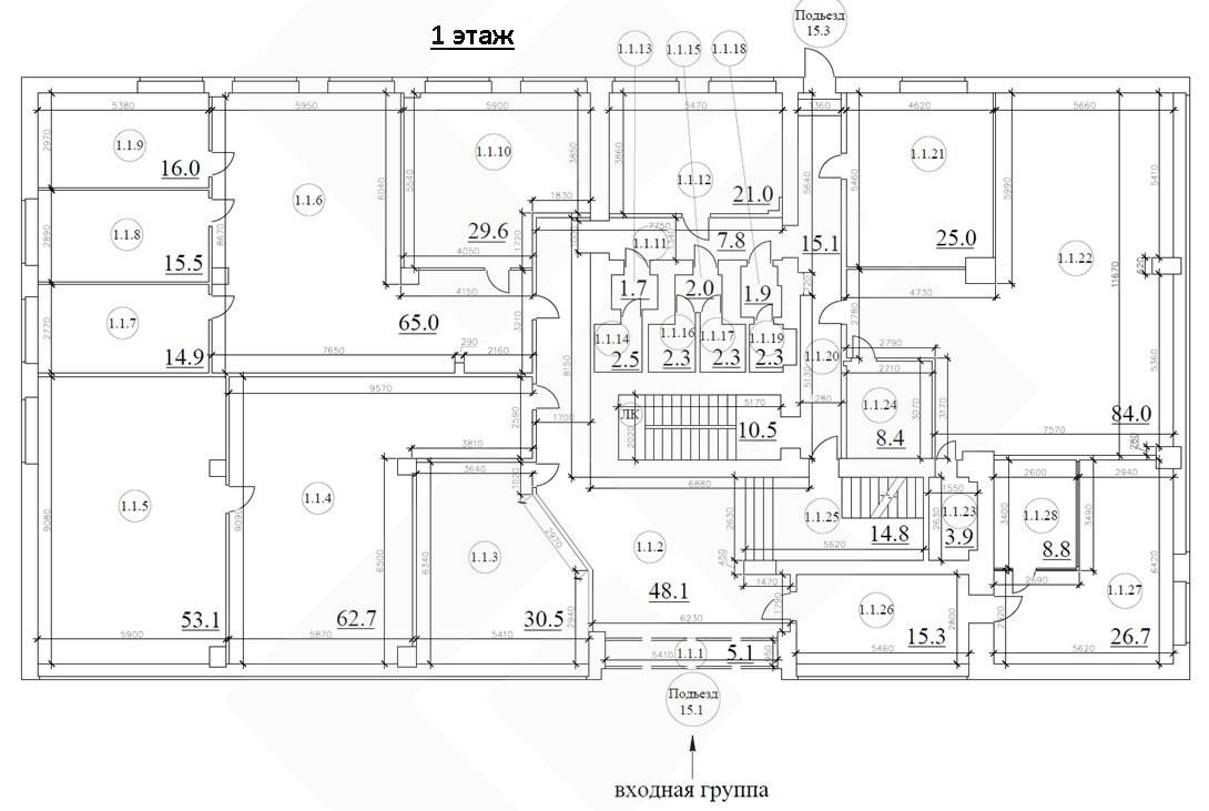 Офисная часть 1233,4 кв.м. и помещение 454,1 кв.м. на цокольном этаже под склад. Имеется вход непосредственно с улицы Годовикова.