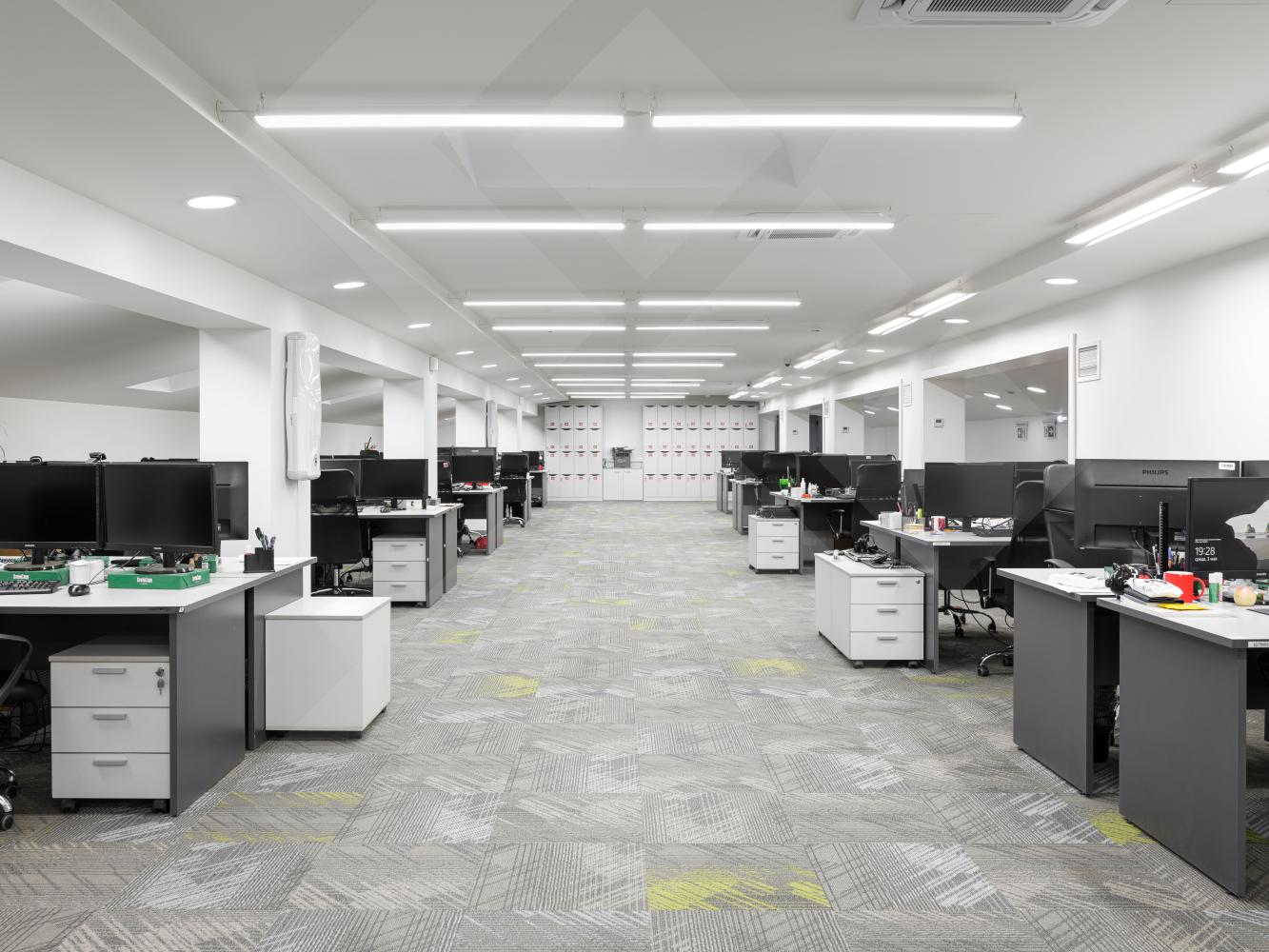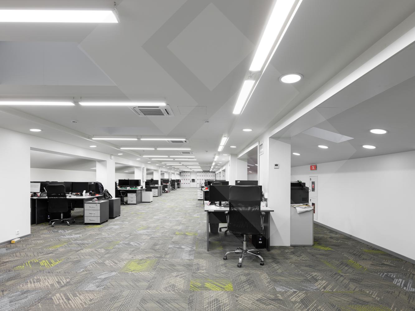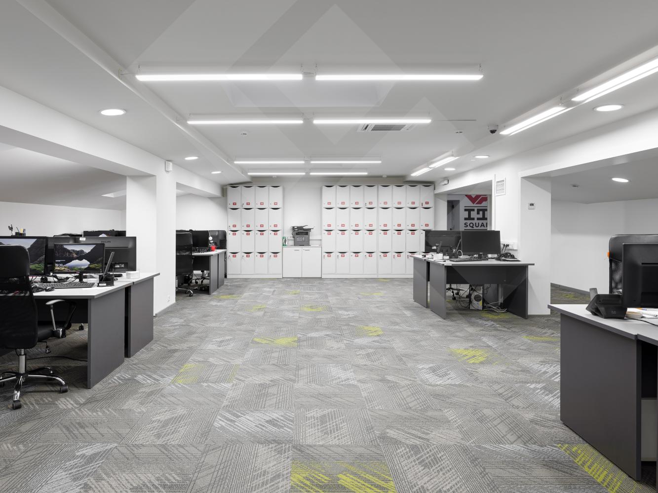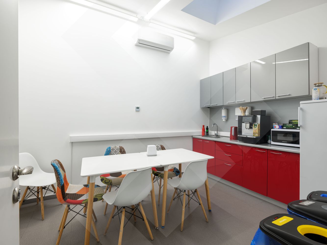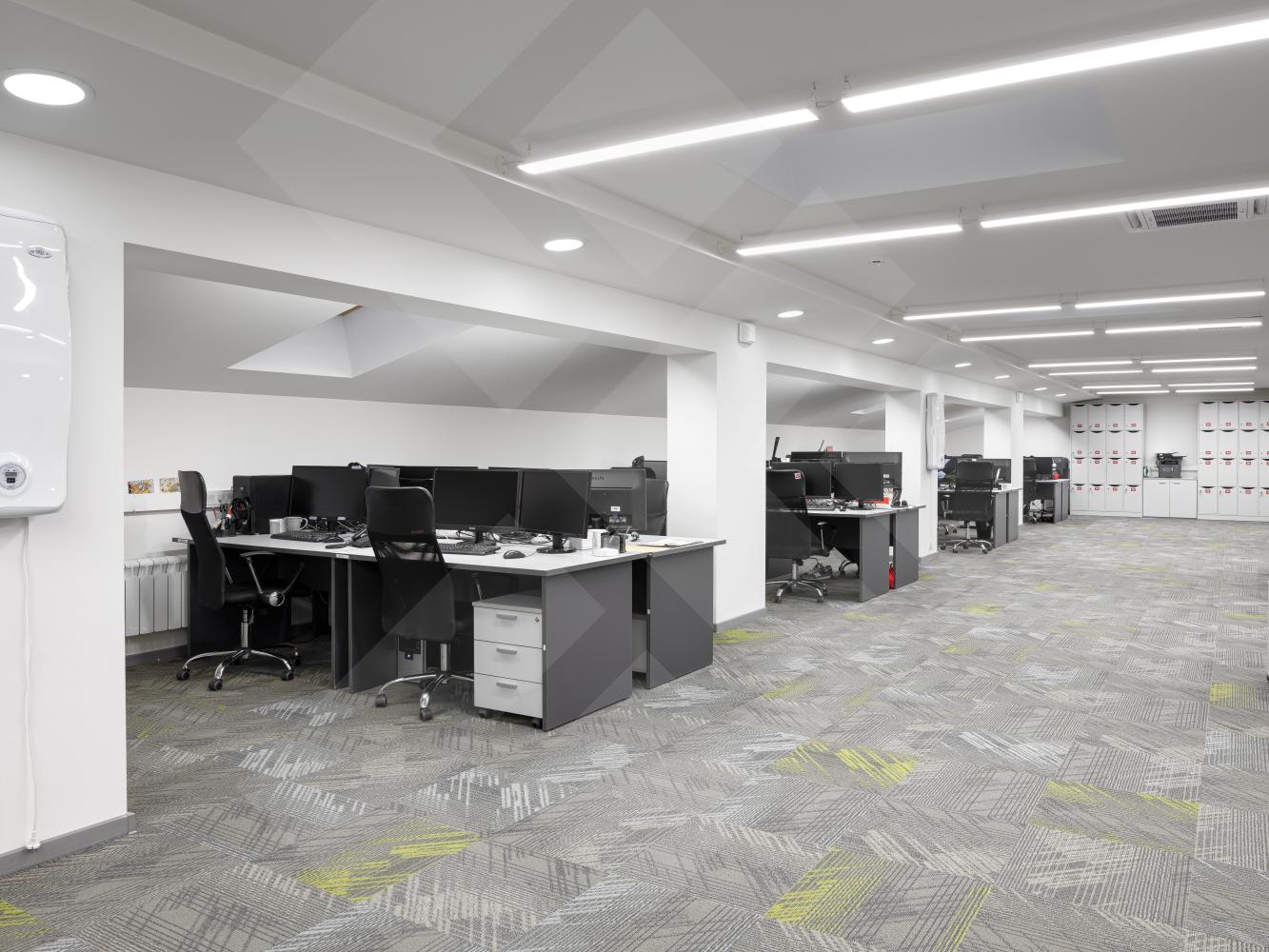 Офис открытой планировки, с собственным санузлом и оборудованной кухней.