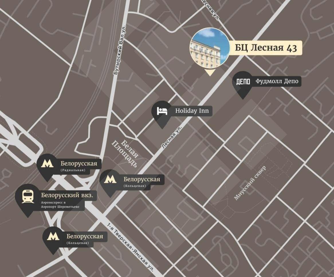 Отличная транспортная доступность: 5 минут пешком от метро «Белорусская» и «Менделеевская», удобный выезд на улицу Лесная, Тверскую и Ленинградский проспект.