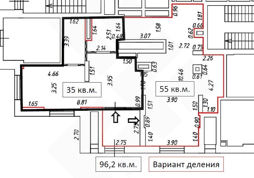 Общей площадью 96,2 кв.м. с возможностью деления.