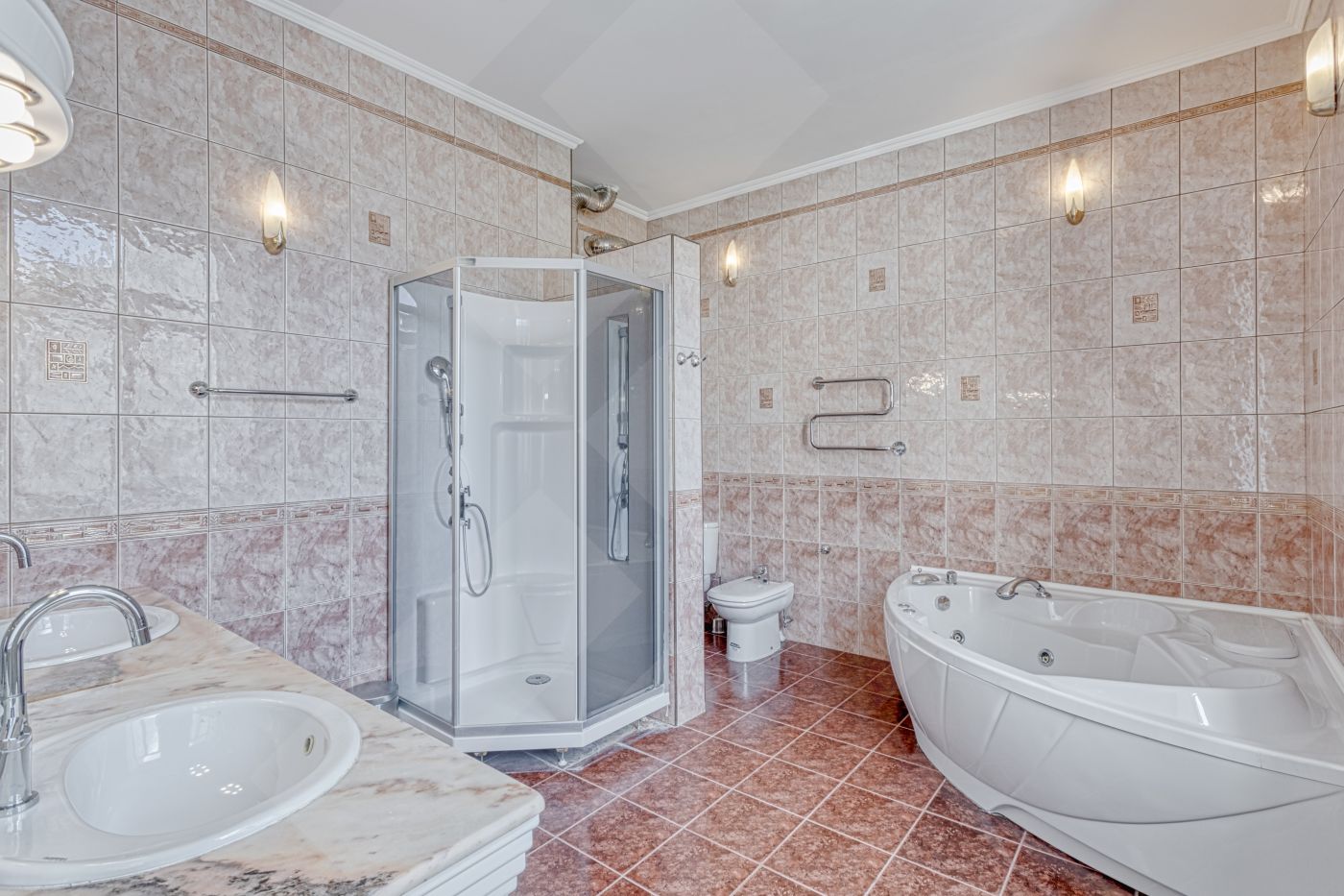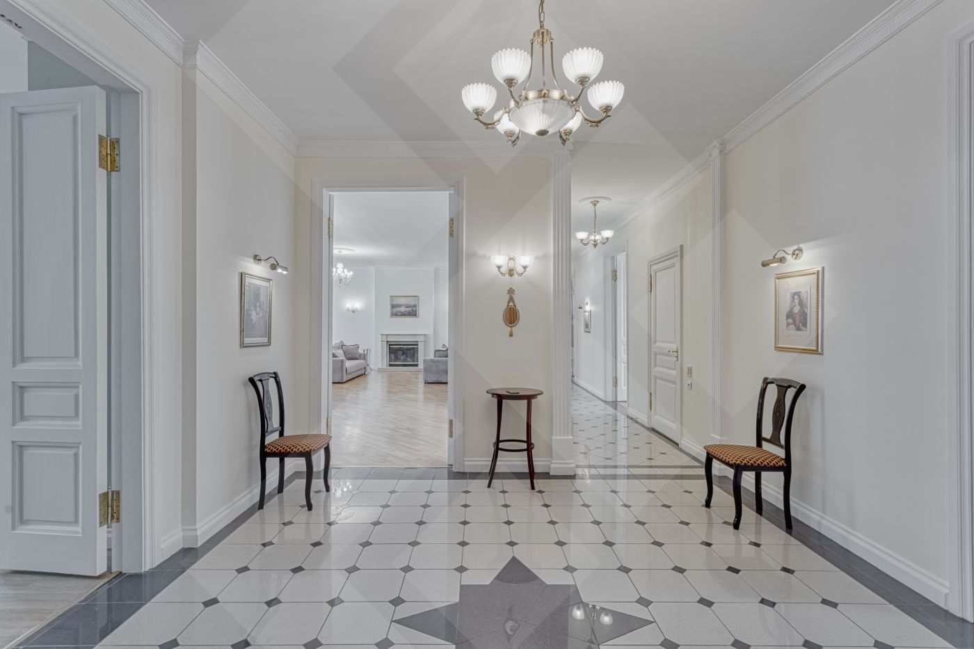 В резиденции выполнен качественный ремонт. Встроенная кухня оснащена современной бытовой техникой (посудомоечная машина,микроволновая печь, измельчитель мусора, два холодильника).Полностью мебелирована. В одной из спален гардеробная комната и собственный санузел (душ-кабина, джакузи, биде) Просторная гостиная (75м) позволит устраивать светские приемы. Пол: паркет, плитка(подогрев). Окна всех спален выходят во двор. Три полных санузла оборудованы качественной сантехникой. Постирочная комната. Камин. Система кондиционирования воздуха.3 выделенные телефонные линии.