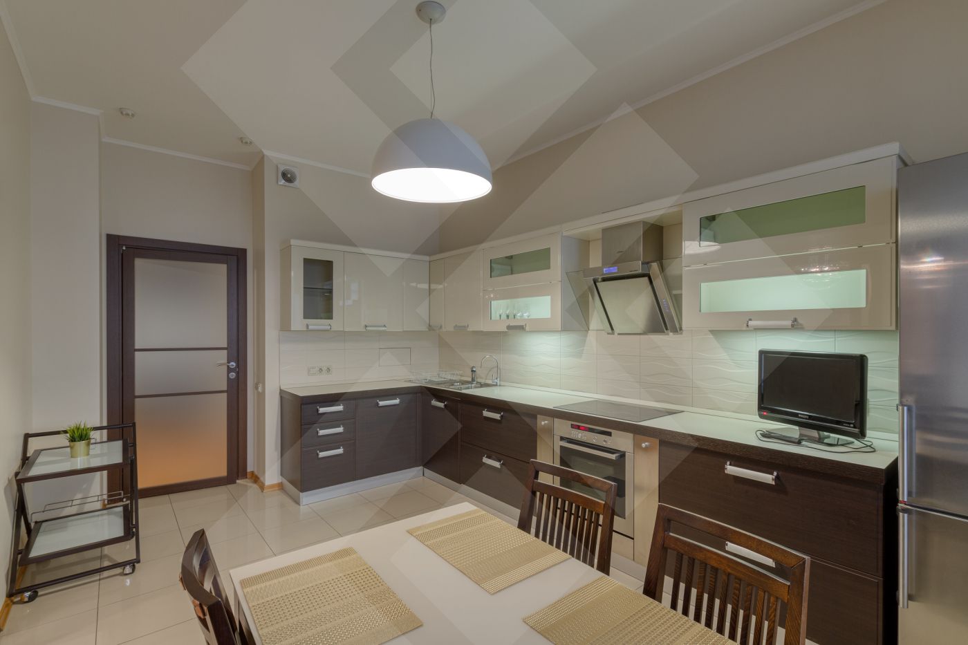 Встроенная кухня со всей необходимой бытовой техникой для комфортной жизни.
