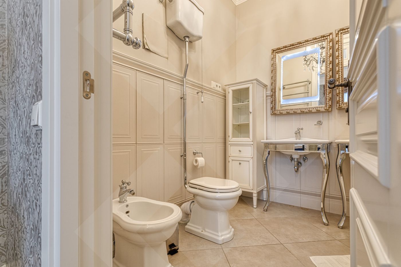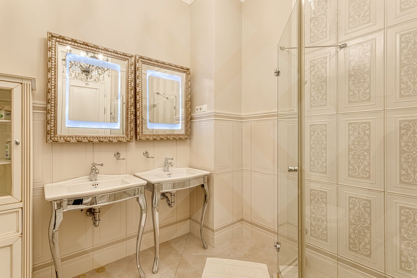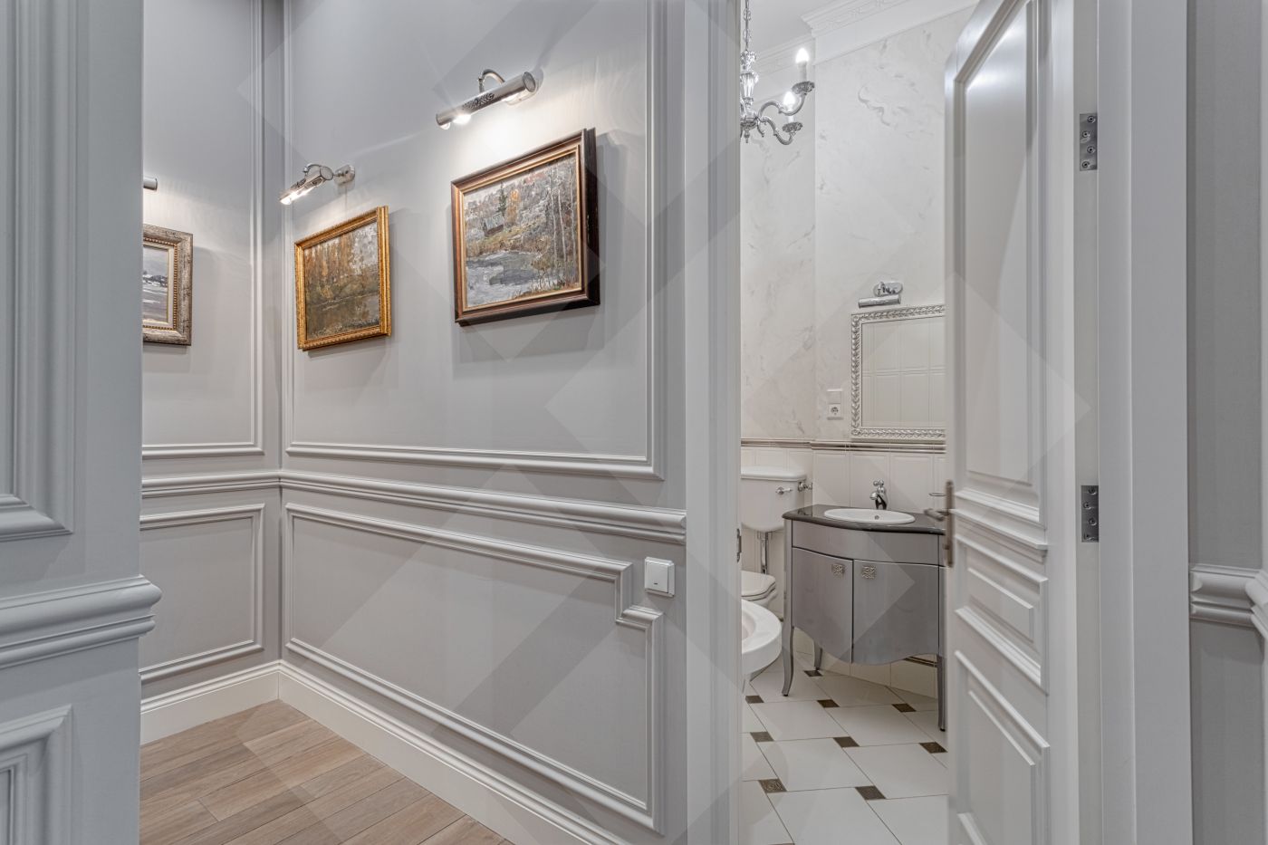 Благодаря правильной геометрической форме комнаты спланированы таким образом, что ни один метр не остался без внимания: функциональная кухня, просторная гостиная комната с выделенной обеденной зоной, три изолированных спальных комнаты, две из которых с собственным с/у и гардеробной комнатой, кабинет с выходом на балкон, гостевой санузел и постирочная комната. Высокие потолки дарят ощущение «воздуха» и пространства.