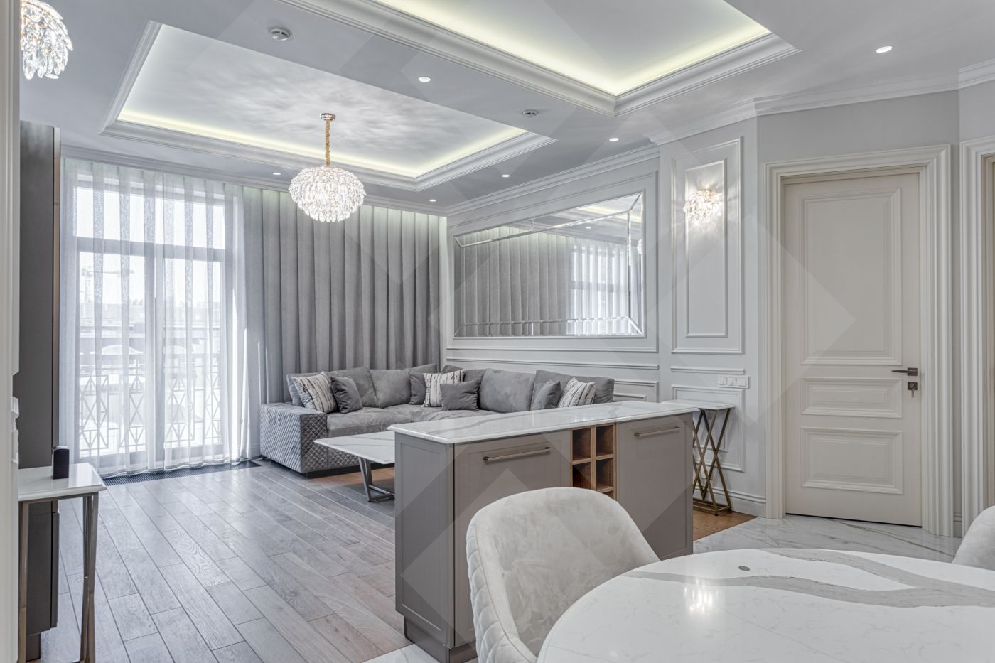 Планировка апартамента: гостиная-кухня, спальня с гардеробной и санузлом (ванна и душевая); кабинет (или еще одна спальня) с санузлом. Выполнен дизайнерский ремонт ремонт. Центральная система кондиционирования, полы с подогревом. Бытовая техника от ведущих мировых производителей стиральная машина с сушкой, индукционная варочная панель, телевизор 85 дюймов, домашний кинотеатр, и прочее. Машино-место в подземном паркинге.