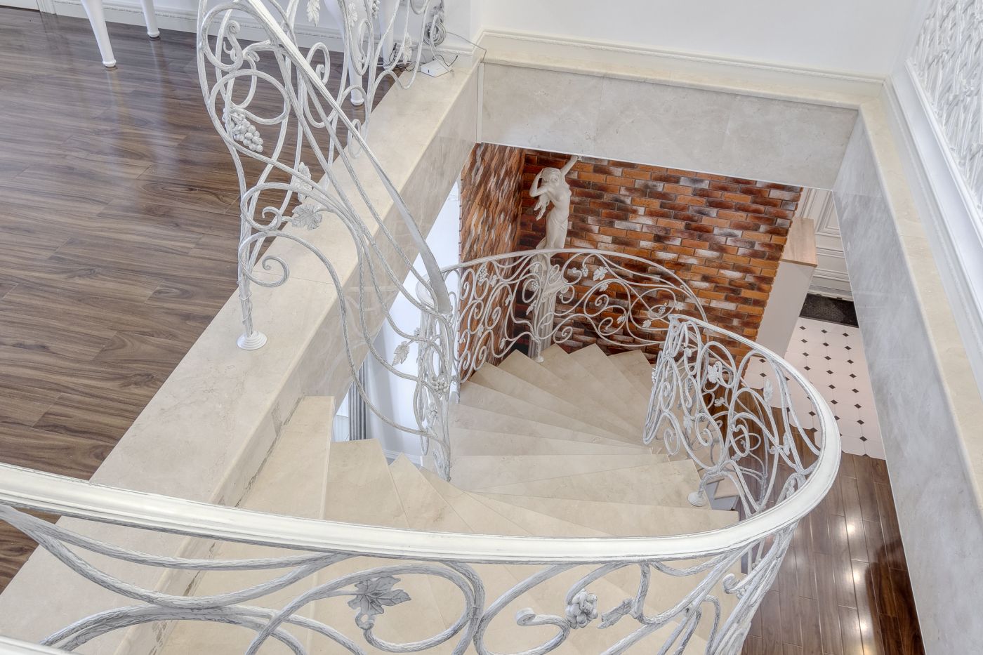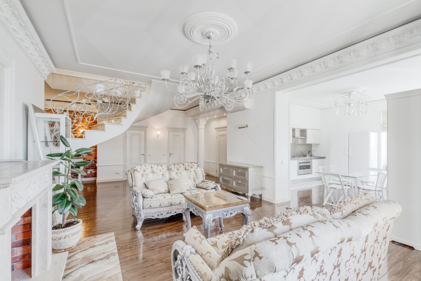 Ключевые черты интерьера — сочетание фактур: теплое натуральное дерево, изящная белая лепнина и стильный декоративный кирпич.