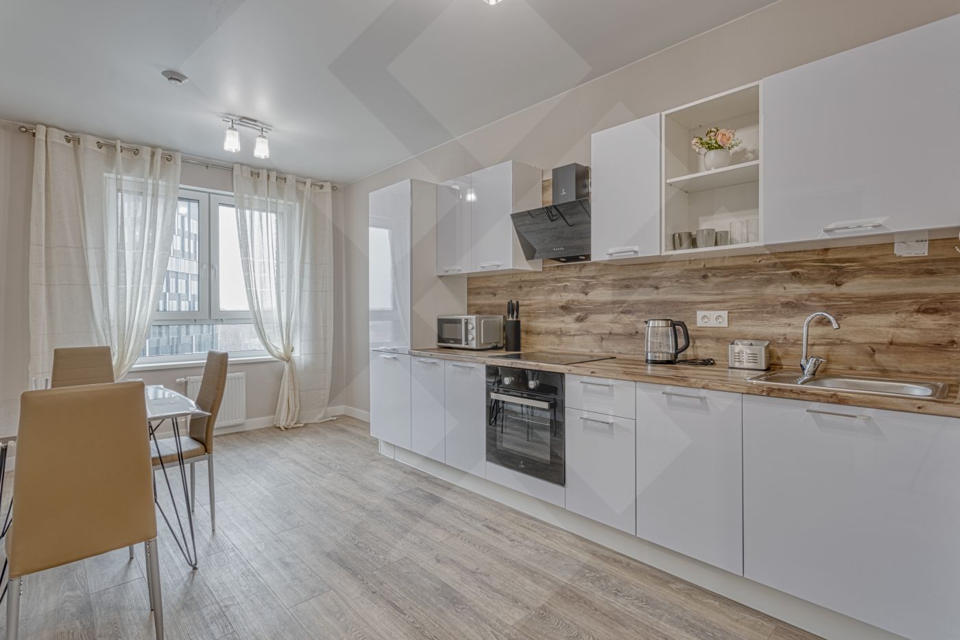 Кухонный гарнитур с духовым шкафом и варочной индукционная поверхностью, стиральная машина с сушкой, посудомоечная машина, холодильник.