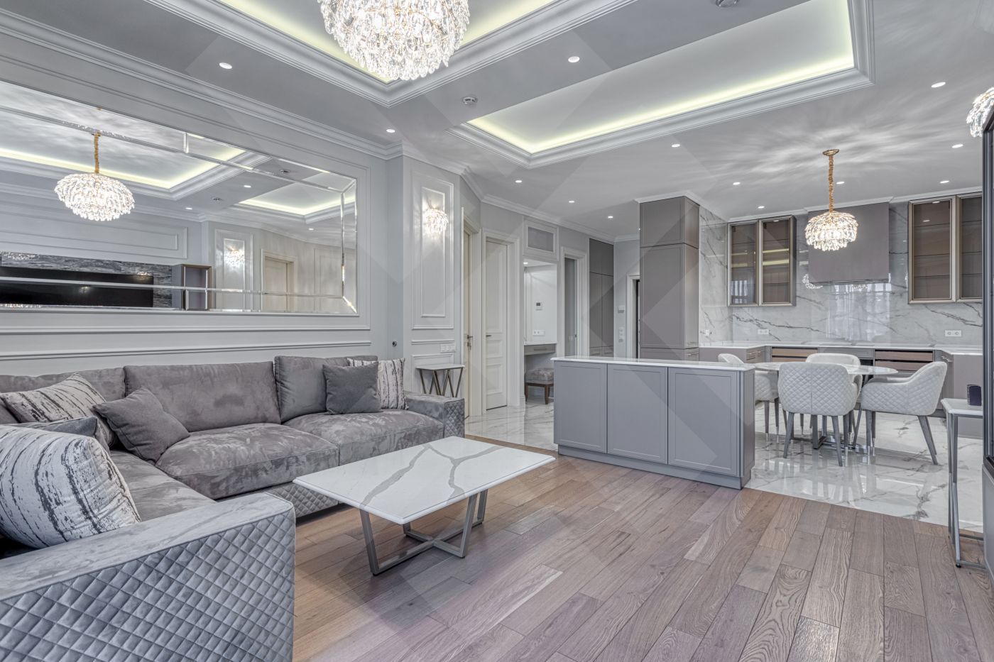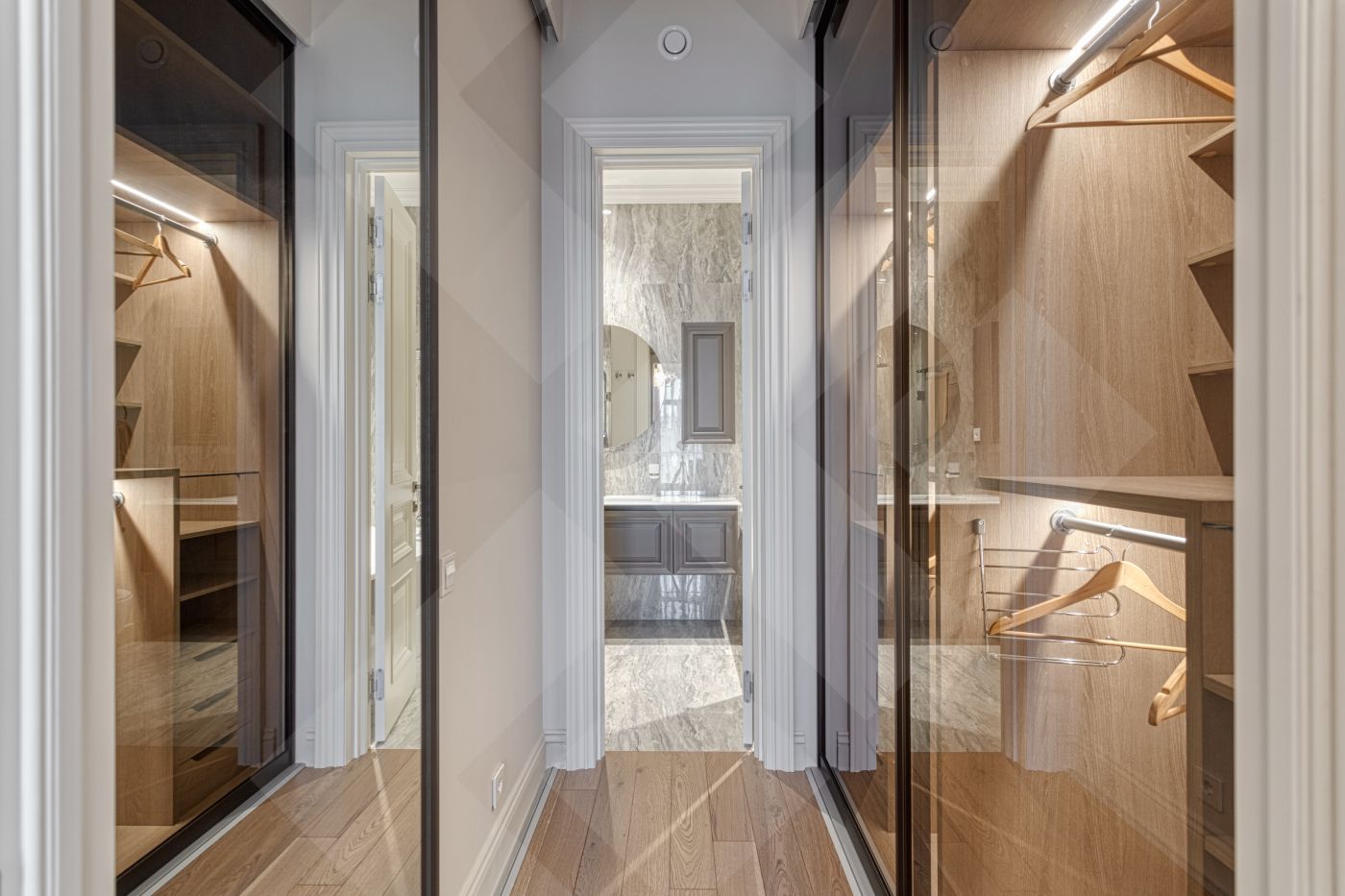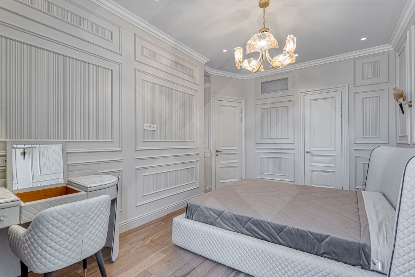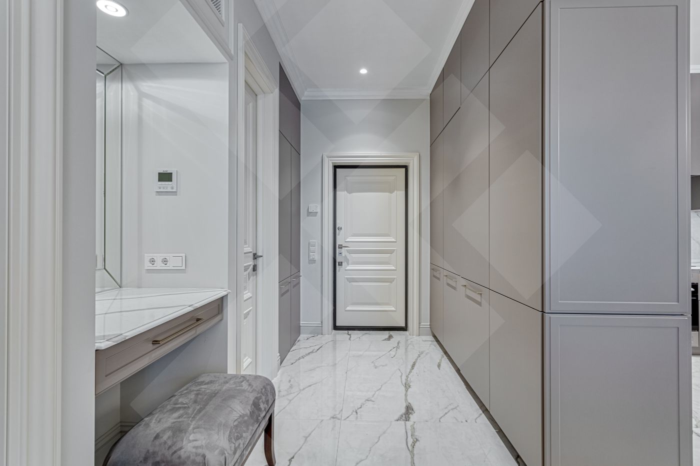 Планировка апартамента: гостиная-кухня, спальня с гардеробной и санузлом (ванна и душевая); кабинет (или еще одна спальня) с санузлом. Выполнен дизайнерский ремонт ремонт. Центральная система кондиционирования, полы с подогревом. Бытовая техника от ведущих мировых производителей стиральная машина с сушкой, индукционная варочная панель, телевизор 85 дюймов, домашний кинотеатр, и прочее. В стоимость входит одно машино-место в подземном паркинге.