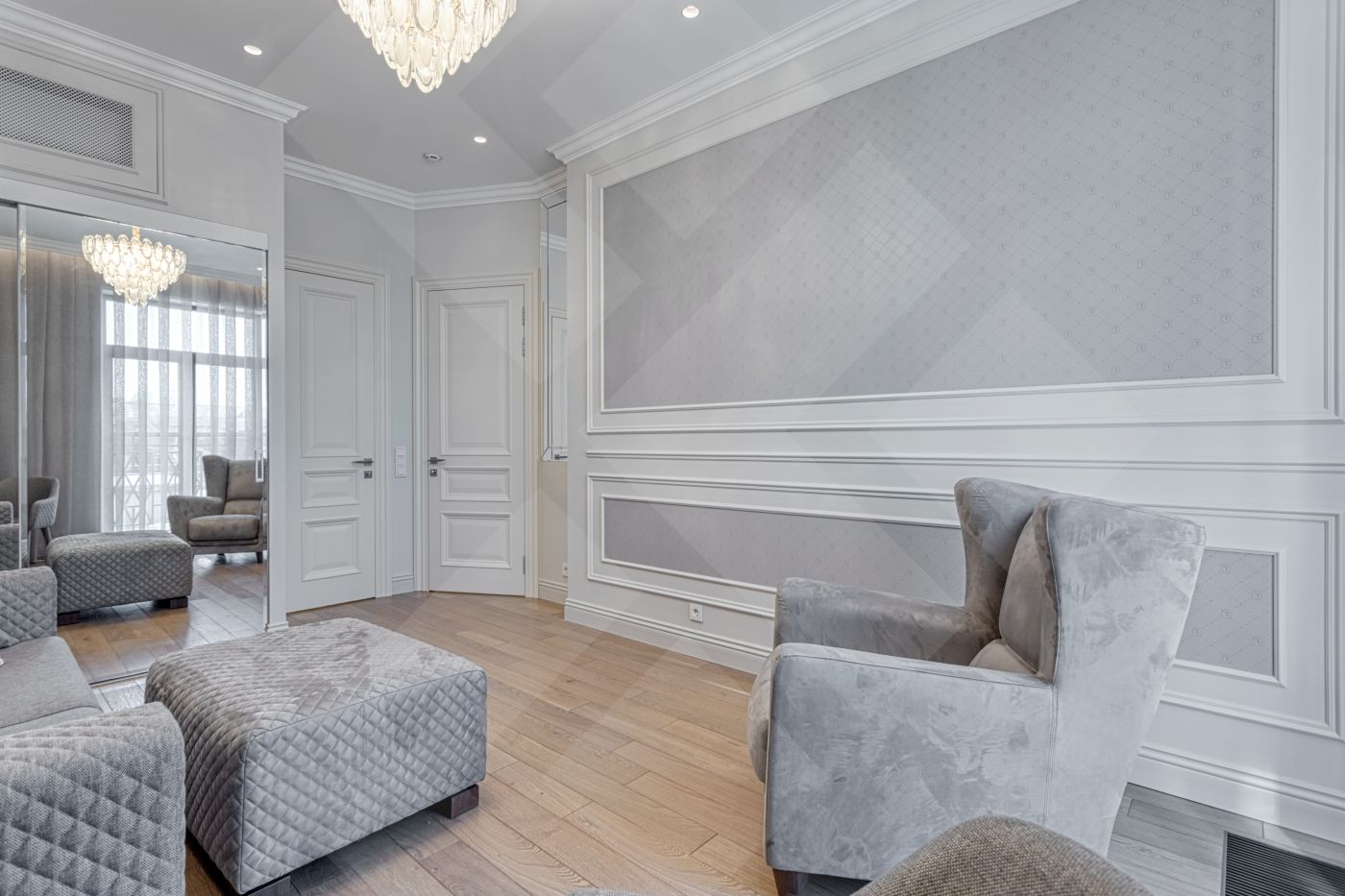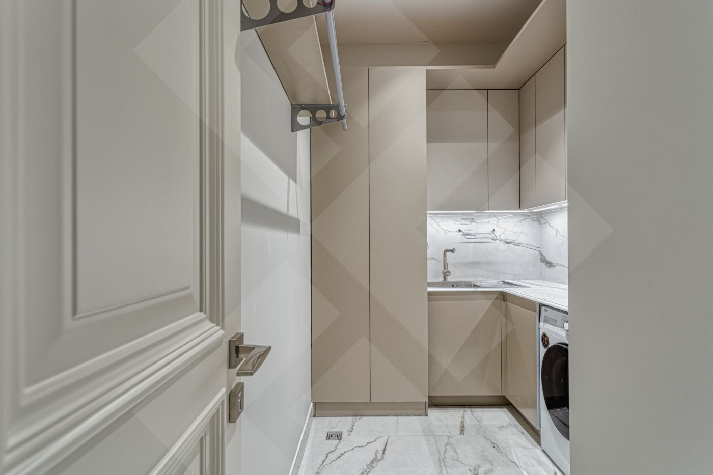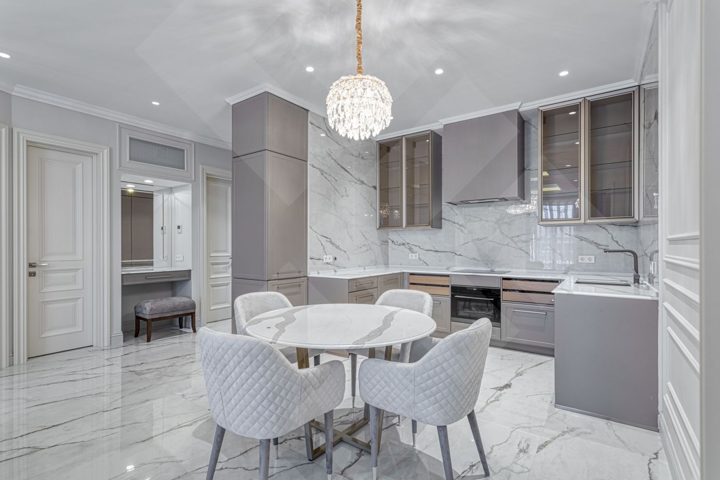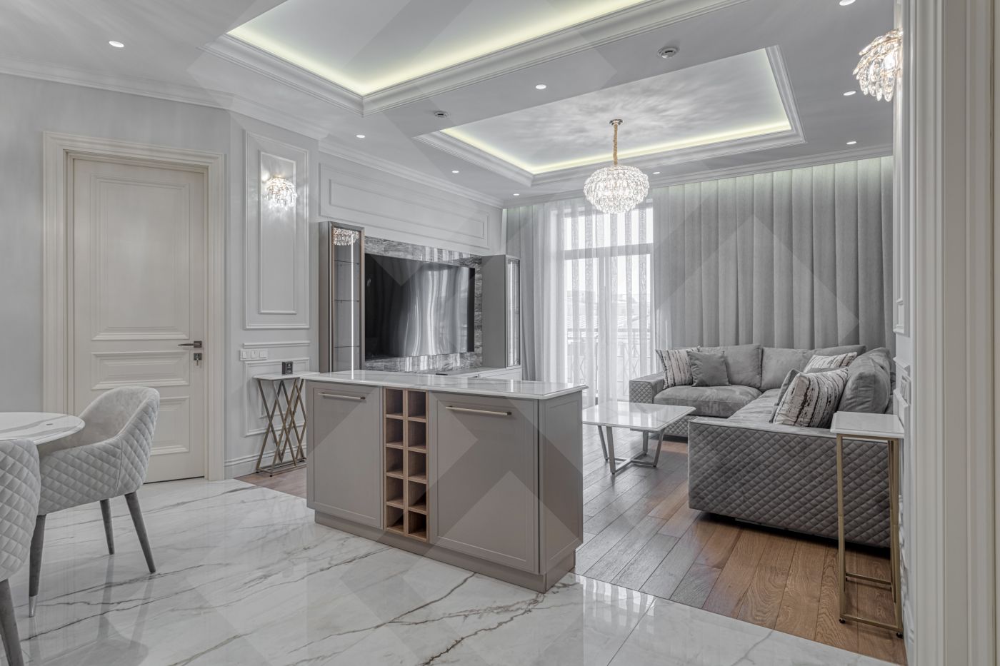 Планировка апартамента: гостиная-кухня, спальня с гардеробной и санузлом (ванна и душевая); кабинет (или еще одна спальня) с санузлом. Выполнен дизайнерский ремонт ремонт. Центральная система кондиционирования, полы с подогревом. Бытовая техника от ведущих мировых производителей стиральная машина с сушкой, индукционная варочная панель, телевизор 85 дюймов, домашний кинотеатр, и прочее. В стоимость входит одно машино-место в подземном паркинге.