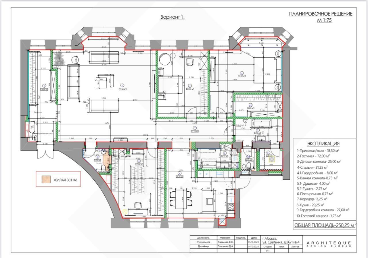 Планировкой предусмотрено: холл, большая гостиная, кухня, спальня/детская, мастер-спальня с гардеробной комнатой, ванная комната с ванной и душевой кабиной, гостевой санузел, постирочная, большая гардеробная комната с окнами.
