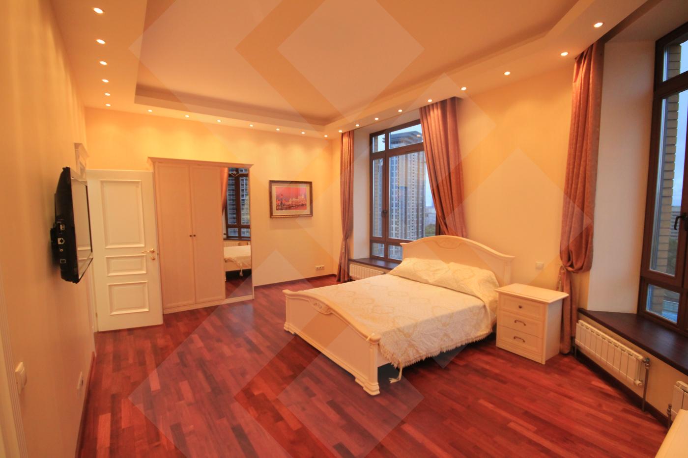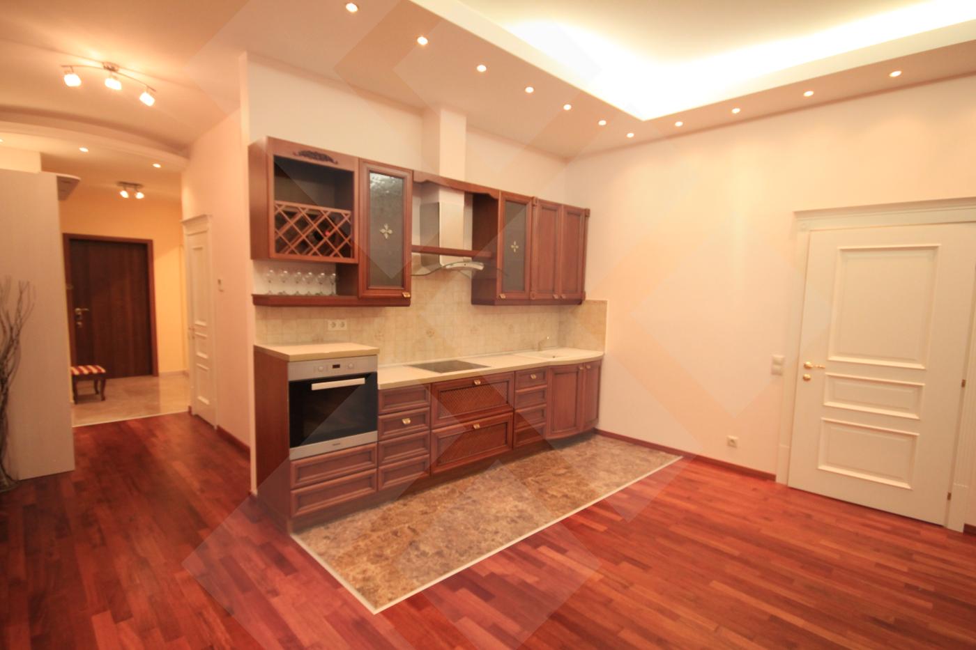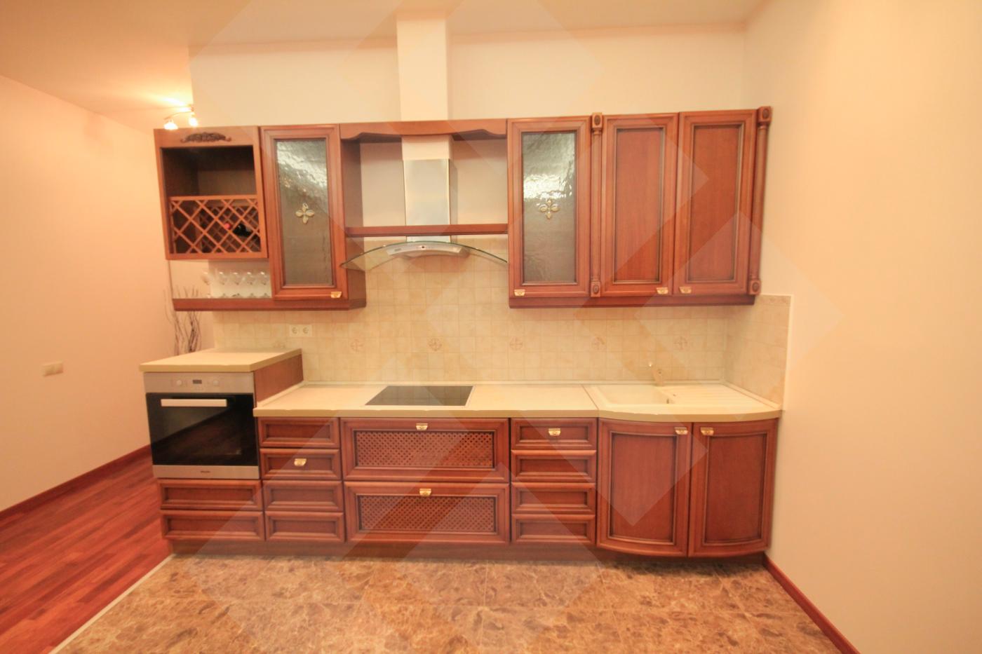 Просторный зал, совмещенный с кухней, просторная светлая спальня, 2 санузла, панорамные окна. Ремонт в классическом стиле. На полу паркет - красное дерево.