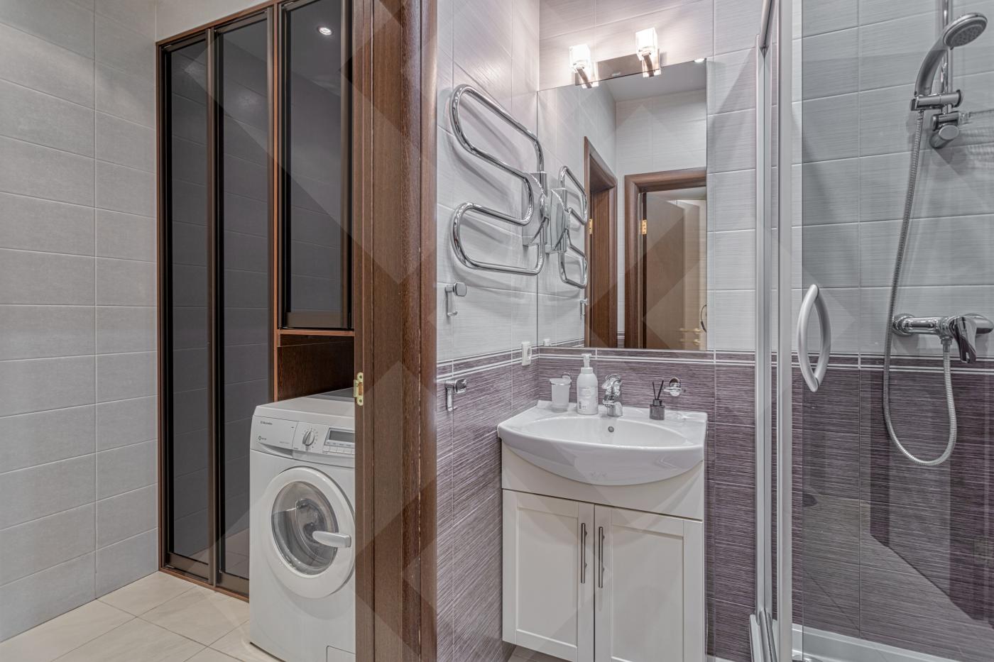 В квартире 2 спальни (21 кв.м. и 26 кв.м., одна из спален с остеклением полукругом), большой зал и кухня, постирочная, 2 сан. узла (один из них при спальне), есть небольшой балкон.