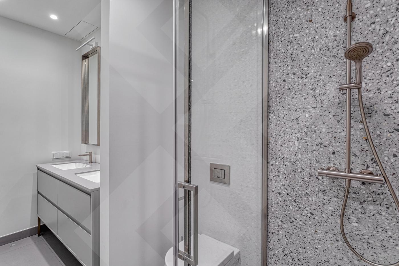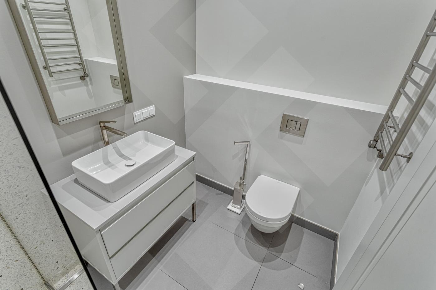 Санузлы облицованы керамогранитом и бетонной плиткой Терраццо. Сантехника марки Villeroy&Boch.