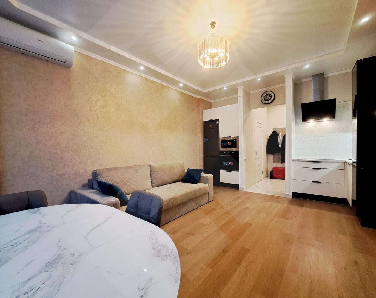 Квартира со свежим дизайнерским ремонтом, мебелью и бытовой техникой как на кухне, так и в комнатах (смотрите фото)