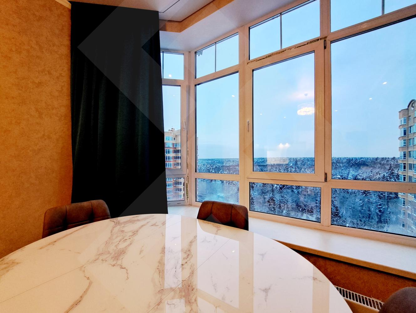 В спальне 2-х спальная кровать, шкаф- купе, выход на балкон; в кухне-гостиной зонирование на столовую с панорамным видом на лес, гостиную и зону кухни.