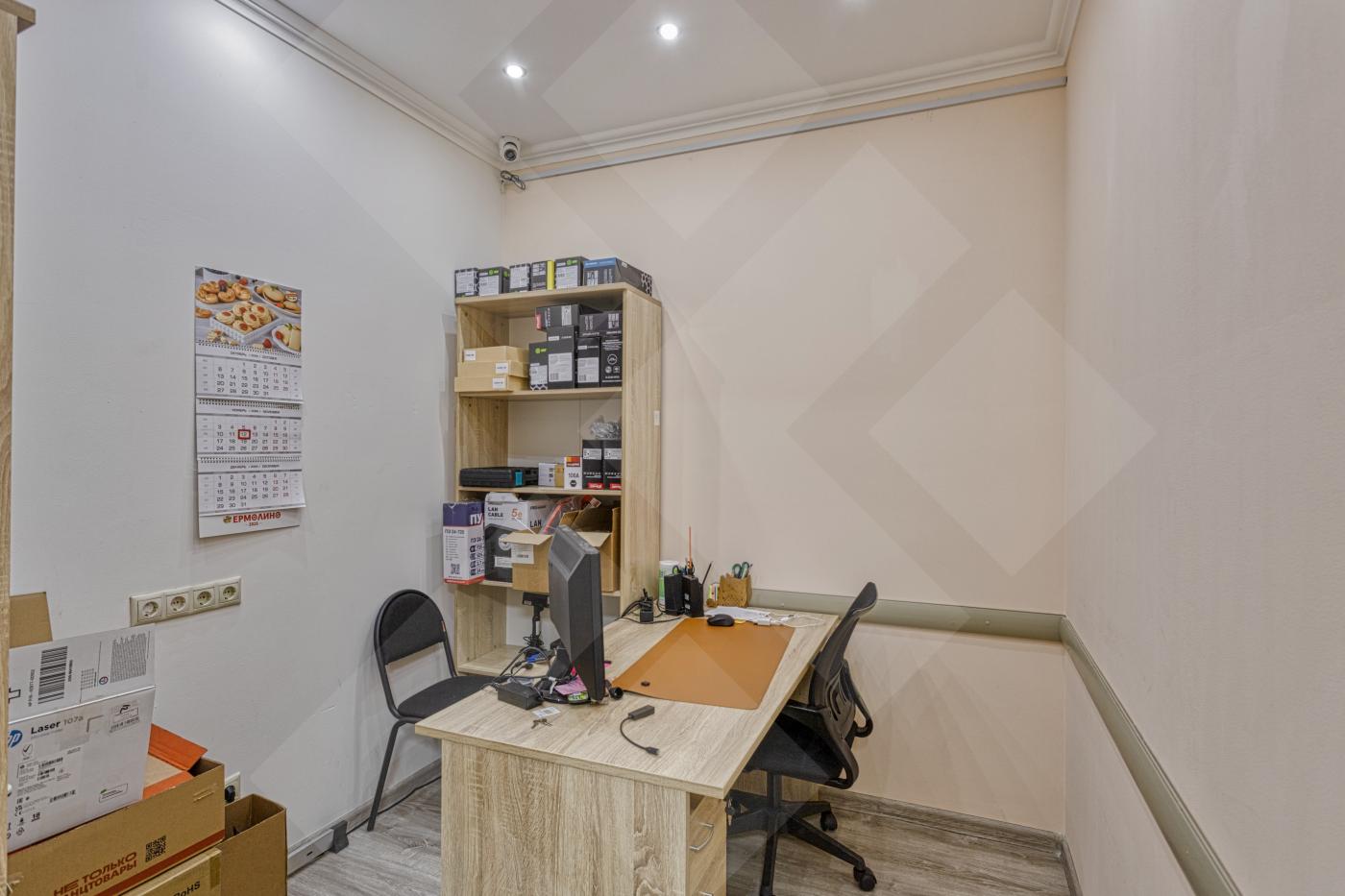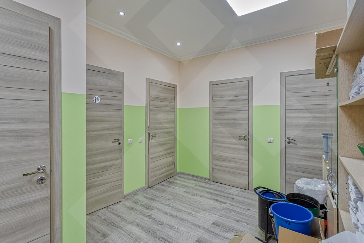 Входная группа, гардеробная, ресепшн, 4 кабинета разной площади каждый со своим окном, комната свободного назначения ( 5-ый кабинет), склад, кухня,