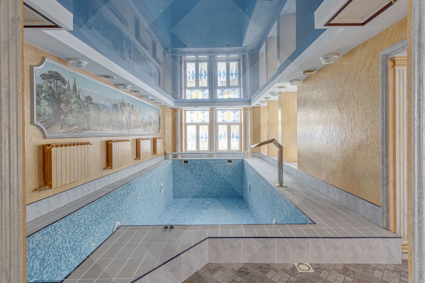 1 этаж: просторный холл, гостиная комната с печным камином , кухня, санузел, бассейн.