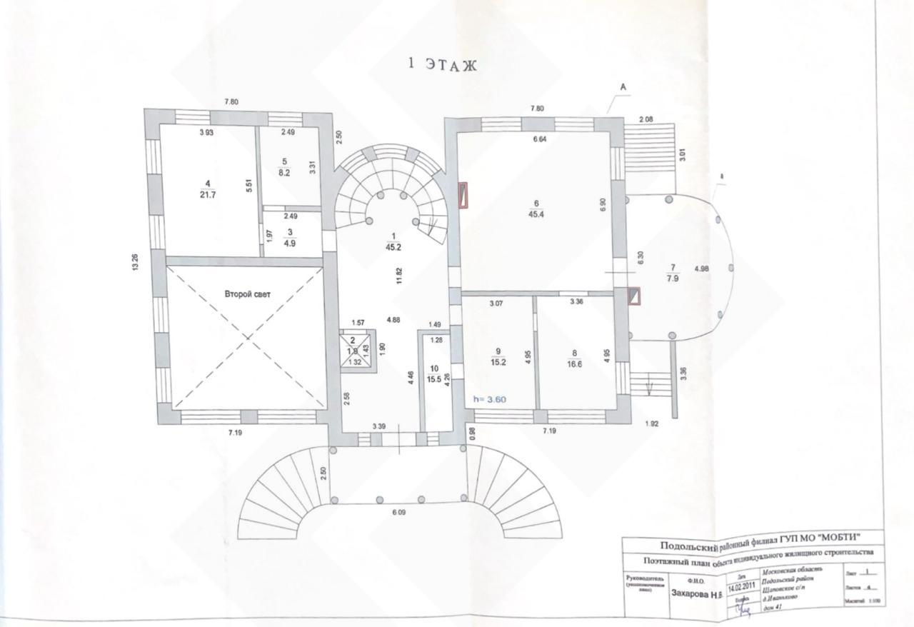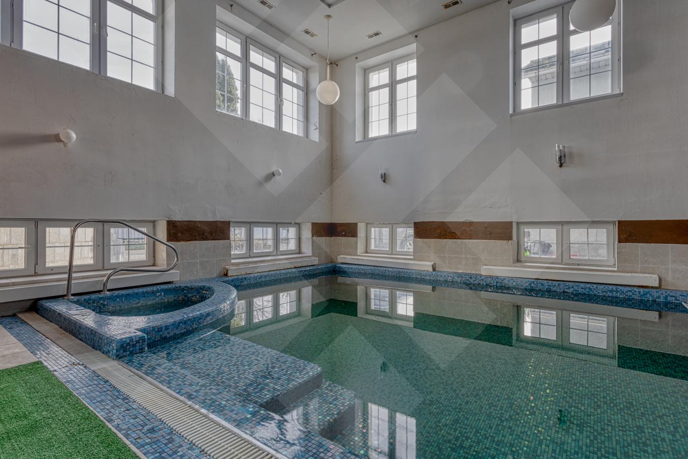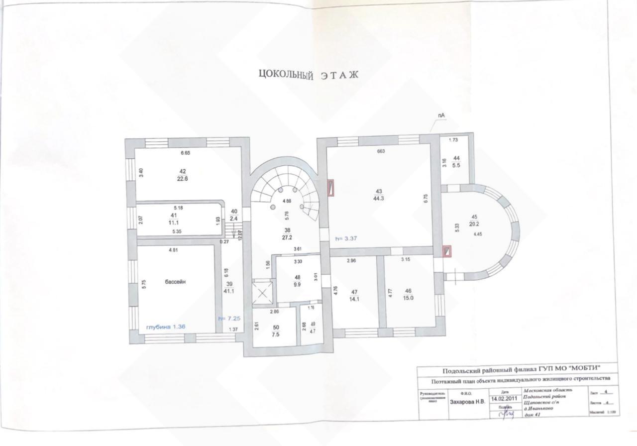 Цоколь: холл, сауна с комнатой отдыха, санузел, спортзал, переливной бассейн 7,56 м с римским входом и джакузи, комната отдыха с печью-мангалом, прачечная, котельная и технические помещения.