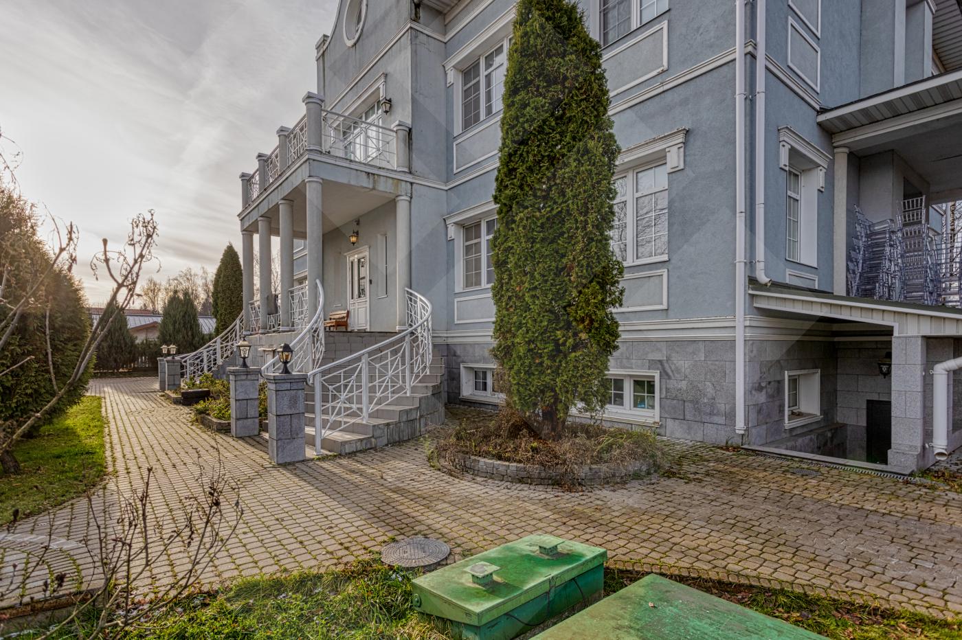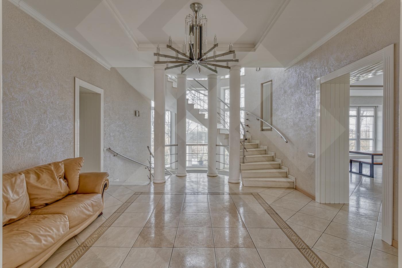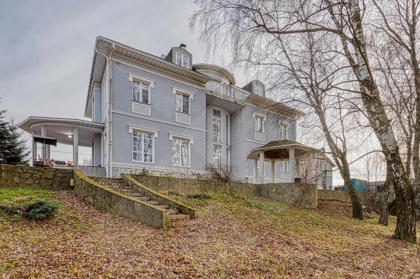 Фасад дома стилизован архитектурными деталями: колоннами, ротондой, усадебным декором, круговыми лестницами. В доме площадью 797 кв. м. 4 этажа и лифт для комфортного перемещения между ними. Всего 8 спален - из них 5 с собственной гардеробной и санузлом. Дом располагается на лесном участке с березовой рощей и выходом к реке Лубянка.